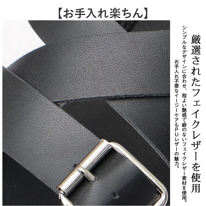 | 商品説明 | 【大人オシャレなモードさ】シンプルで色んなコーデが決まるストラップサンダル。【上品かつトレンドなデザイン】シンプルなダブルストラップのアッパーにスクエアトゥでトレンド感をプラス。【メタルパーツがポイント】大きめのシルバーパーツをバックルに使用。シャープさがありながらアクセントに。【安定感ある歩行を】ヒールとソール部分は同じ高さに設計しフラットな仕上がり。ヒールに慣れていない方も安心。【ラフ過ぎない微光沢】適度な光沢で幅広く合わせやすい合皮素材を使用。ラフ過ぎないのが嬉しい♪【お手入れ楽ちん】合皮はPUレザーを使用し、お手入れ不要なイージーケアもポイント。【着脱スムーズ】ストラップのバックル部分にはフックベルトを採用し、ベルトの調節なしで着脱が可能。【程よいフィット感で履ける】伸縮性のあるエラスティックバンドを取り入れ、程よいフィット感で履けるのもGOOD。【長時間履いても負担を軽減】インソールはクッション材でできており、足への負担を軽減◎【雨の日やレジャーも安心】アウトソールは凹凸が刻み込まれた作り。濡れた路面やタイルをしっかりグリップ。【1つ持っていると重宝】オールブラックカラーで韓国系ファッションやストリートなど、色んなスタイルにマッチ☆ |
