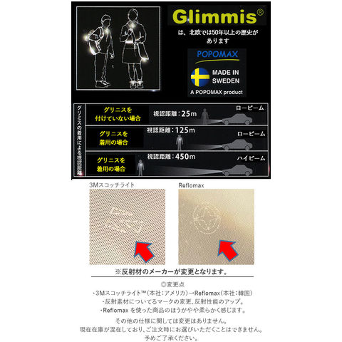 | 商品説明 | キラッと光って命を守る!北欧スウェーデン発のキラキラ交通安全グッズ、Glimmis(グリミス)リフレクターに、ムーミンファミリーを象った新デザインが登場!北欧では50年以上の歴史を持つグリミスは、リフレクター(反射板)素材を使用して、暗闇でも歩行者の存在を確実にドライバーに知らせる交通安全グッズ。グリミスのリフレクター素材は、ヨーロッパ規格(※)に準拠して制作された、高品質な反射素材「マイクロプリズム」の再帰性反射材を使用。通常のカプセルレンズタイプの反射シートの約3倍の輝度を持つ素材。アクセサリー感覚でランドセルやカバンにつけられて、交通事故からあなた自身や大切な人を守ってくれる♪カバンだけでなく、ジャケットやベビーカー、お散歩中のワンちゃんの首輪などにも。歩行者の交通死亡事故は、夕方から夜間にかけて多く発生し、昼間の約3倍。グリミスで自動車ヘッドライトの光をしっかり反射して交通事故を防止!例えば、夜間、自動車をロービームで運転しているドライバーが歩行者を確認出来る視認距離は約25メートル。グリミスを着用していれば、ロービームでは125メートル手前、ハイビームだと450メートル手前から歩行者の確認が可能に!ムーミンやスナフキン、ミィなど、おなじみのキャラクターたちのほのぼのとした雰囲気が可愛い♪大人も子供も、男の子も女の子も着用しやすいキュートなデザイン!※ヨーロッパ規格(EN:EuropeanNorm)は、欧州標準化委員会が作成した統一規格であり、国家規格として採用されています。これらの規格の実施は主にEU諸国です。これらの規格を満たしている製品には、CEマーク関連する規格ナンバーの両方を印さなければなりません。「グリミス」は、CE(EN13356標準)の承認を得ています。 |
