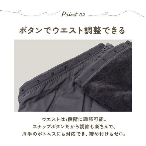| 商品説明 | 【寒い季節を乗り越える心強い味方】お腹まわりや足元を優しく包み込んで、手軽に防寒対策!「キルティング巻スカート」。【ボトムスの上から巻き付けるだけ】サッと巻いてスナップボタンで留めればOK!どこでも手軽に使える、ふんわり軽い巻スカート。【自分サイズに心地よくフィット】ウエストはスナップボタンで、7段階調節可能。厚手のボトムスにも対応でき、締め付けもゼロ。【適度なハリ感に撥水性をプラス】表地はハリのあるタフタで水滴等を弾く撥水加工済み。なめらかでピーチタッチな肌触りも特徴。(※)完全防水ではありません。【優しい肌触りでしっかりあたたかい】裏地は裏起毛より毛足が長く、保温性の高いシャギーフリース。ふわっと柔らかな質感♪【小物を入れておけるポケット】左右には便利なポケットを配置。スマホや薄手のハンカチなどをIN。【ひざ掛け代わりにもできて万能】広げればひざ掛けとしても活用◎ご自宅内ではもちろん、ゴミ出しやアウトドア、オフィスでも!【手洗いできてお手入れラクラク】汚れが気になったら、自宅で手洗い可能。ガシガシ使えていつも清潔をキープ。【シンプルなベーシックカラー】ふっくらキルティングに、落ち着きがあり合わせやすいカラーリング。飽きが来ず長く愛用☆ |