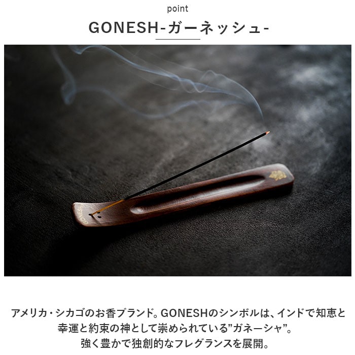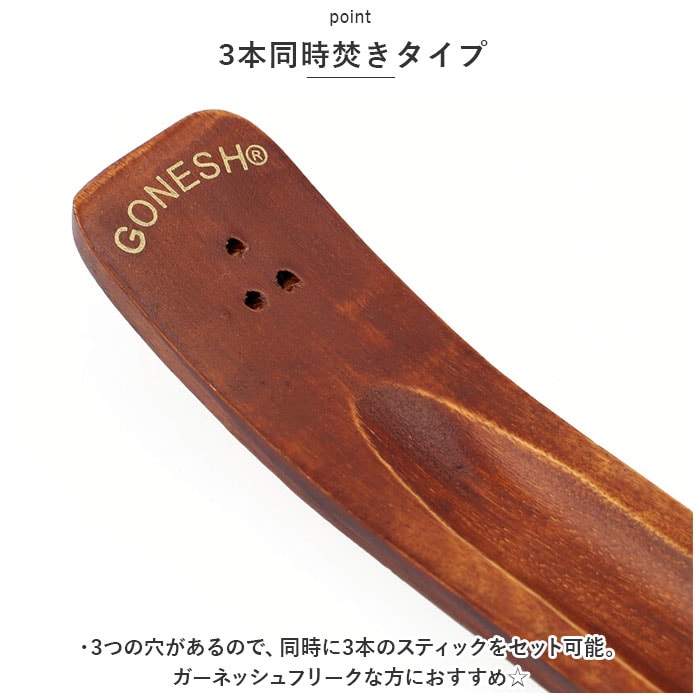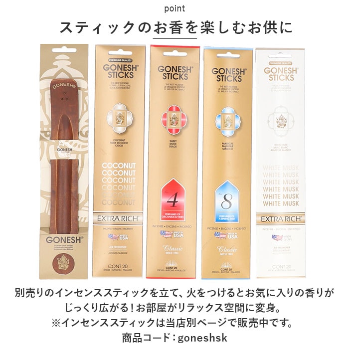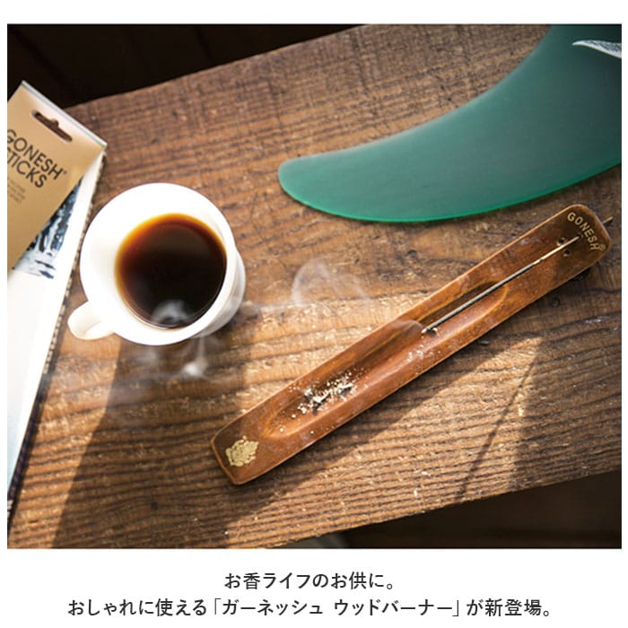 | 商品説明 | お香ライフのお供に。おしゃれに使える「ガーネッシュ ウッドバーナー」が新登場。【GONESH-ガーネッシュ-】アメリカ・シカゴのお香ブランド。GONESHのシンボルは、インドで知恵と幸運と約束の神として崇められている”ガネーシャ”。強く豊かで独創的なフレグランスを展開。【ナチュラルなデザイン】自然な風合いが美しい木製のアイテム。空間の雰囲気を邪魔せず、インテリアの一部に。ガネーシャ神のプリントデザインがアクセントに。【スティックのお香を楽しむお供に】別売りのインセンススティックを立て、火をつけるとお気に入りの香りがじっくり広がる!お部屋がリラックス空間に変身。(※インセンススティックは当店別ページで販売中です。商品コード:goneshsk)【3本同時焚きタイプ】・3つの穴があるので、同時に3本のスティックをセット可能。ガーネッシュフリークな方におすすめ☆ |