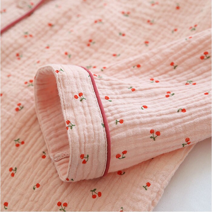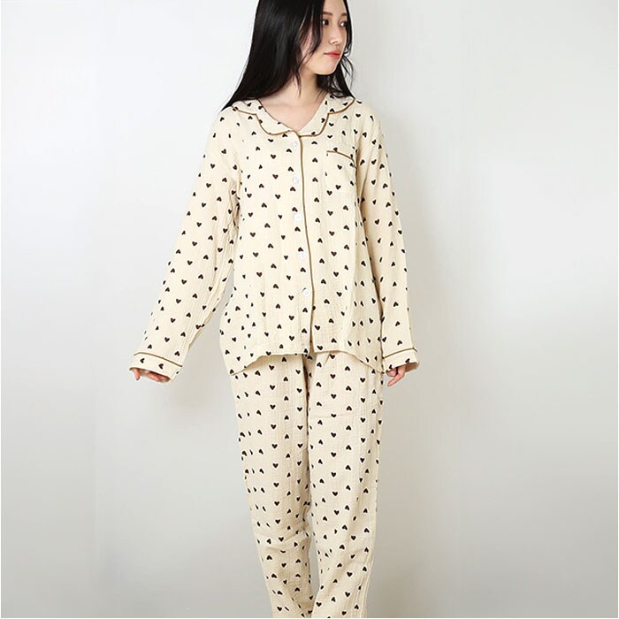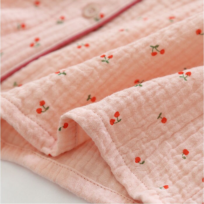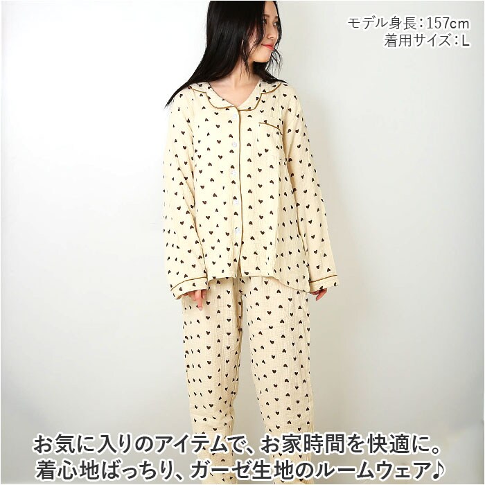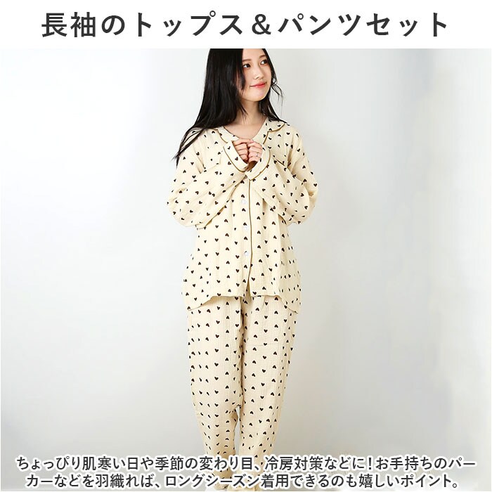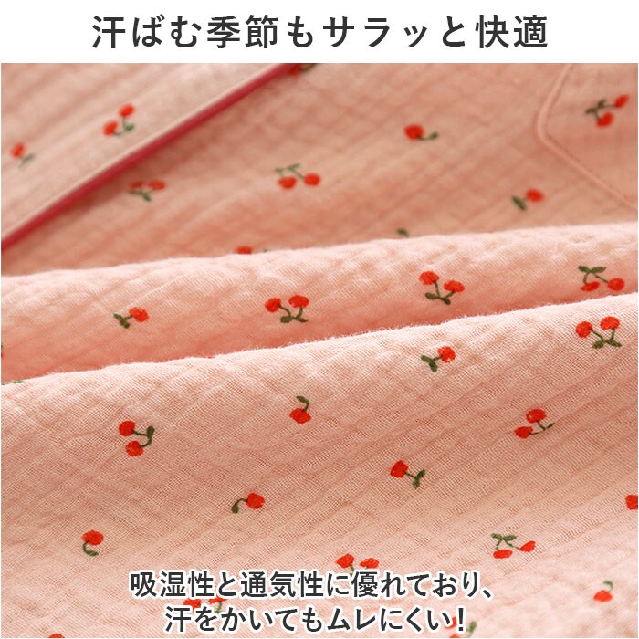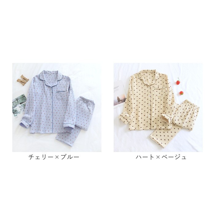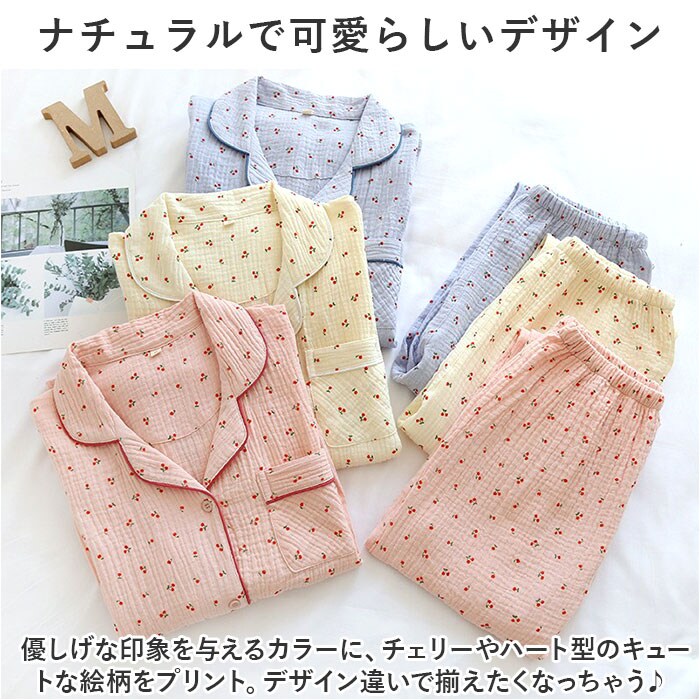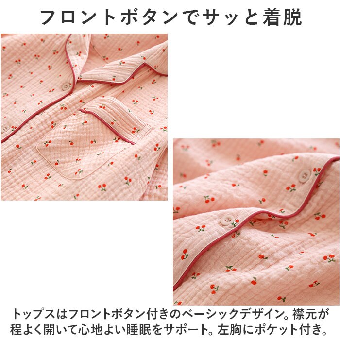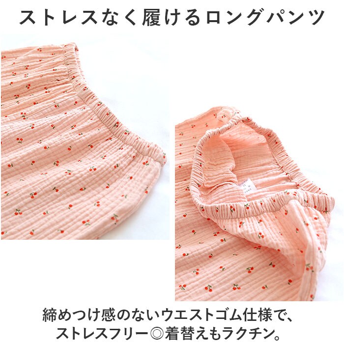 | 商品説明 | お気に入りのアイテムで、お家時間を快適に。着心地ばっちり、ガーゼ生地のルームウェア♪【長袖のトップス&パンツセット】ちょっぴり肌寒い日や季節の変わり目、冷房対策などに!お手持ちのパーカーなどを羽織れば、ロングシーズン着用できるのも嬉しいポイント。【ふんわり柔らかなコットンガーゼ】サラッと着られるちょうどいい生地感。肌当たりの優しいガーゼ生地を使用しているから、チクチク感がなくデリケート肌でも安心。【汗ばむ季節もサラッと快適】吸湿性と通気性に優れており、汗をかいてもムレにくい!【フロントボタンでサッと着脱】トップスはフロントボタン付きのベーシックデザイン。襟元が程よく開いて心地よい睡眠をサポート。左胸にポケット付き。【ストレスなく履けるロングパンツ】締めつけ感のないウエストゴム仕様で、ストレスフリー◎着替えもラクチン。【ナチュラルで可愛らしいデザイン】優しげな印象を与えるカラーに、チェリーやハート型のキュートな絵柄をプリント。デザイン違いで揃えたくなっちゃう♪ |