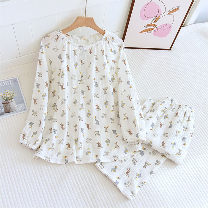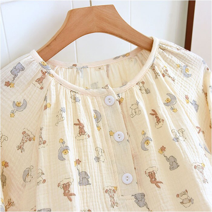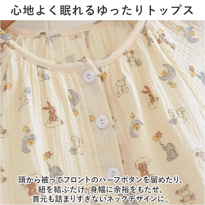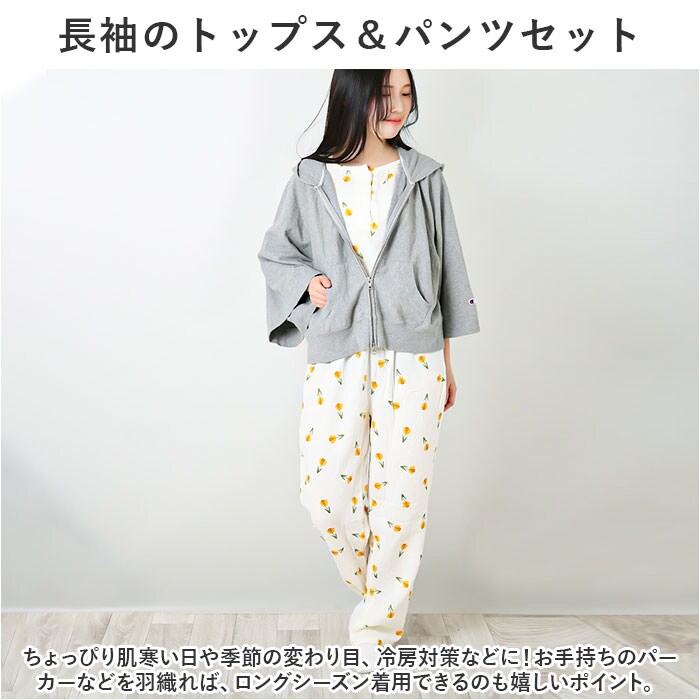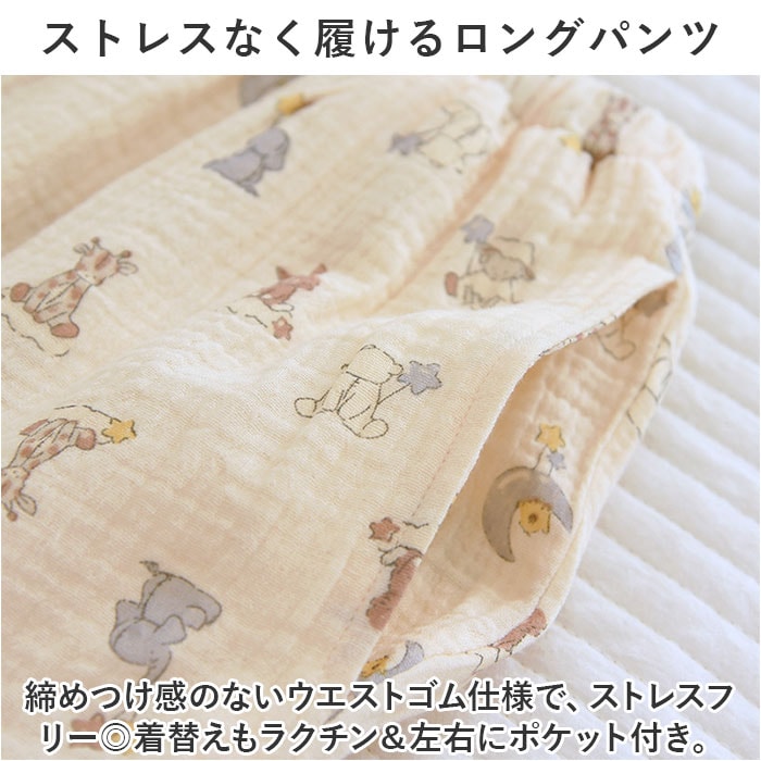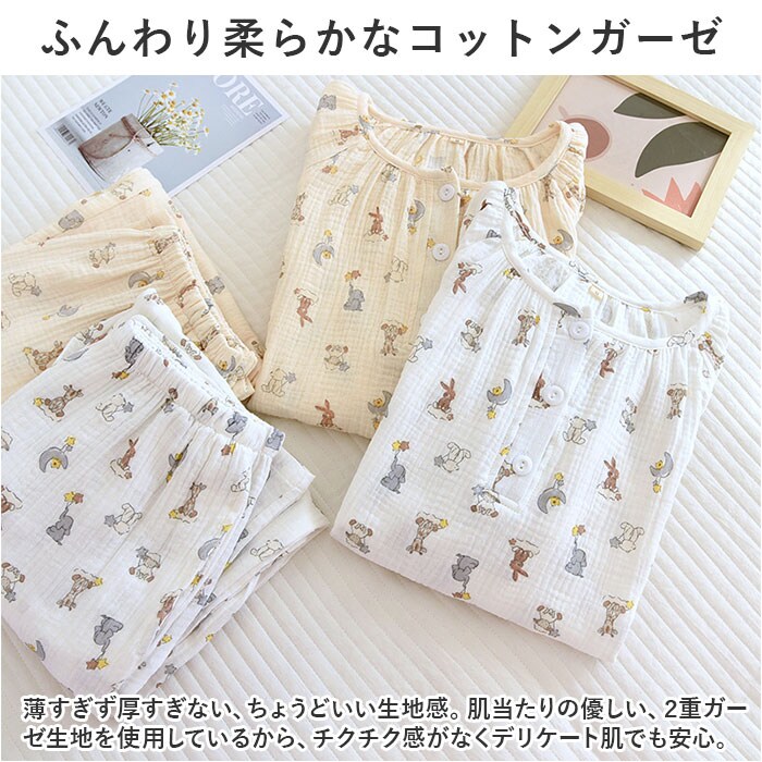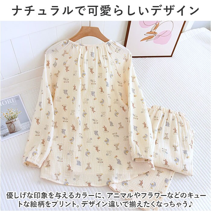 | 商品説明 | お気に入りのアイテムで、お家時間を快適に。着心地ばっちり、ガーゼ生地のルームウェア♪【長袖のトップス&パンツセット】ちょっぴり肌寒い日や季節の変わり目、冷房対策などに!お手持ちのパーカーなどを羽織れば、ロングシーズン着用できるのも嬉しいポイント。【ふんわり柔らかなコットンガーゼ】薄すぎず厚すぎない、ちょうどいい生地感。肌当たりの優しい、2重ガーゼ生地を使用しているから、チクチク感がなくデリケート肌でも安心。【汗ばむ季節もサラッと快適】吸湿性と通気性に優れており、汗をかいてもムレにくい!【心地よく眠れるゆっったりトップス】頭から被って、フロントのハーフボタンを留めるだけ。身幅に余裕をもたせ、首元も詰まりすぎないネックデザインに。【ストレスなく履けるロングパンツ】締めつけ感のないウエストゴム仕様で、ストレスフリー◎着替えもラクチン&左右にポケット付き。【ナチュラルで可愛らしいデザイン】優しげな印象を与えるカラーに、アニマルやフラワーなどのキュートな絵柄をプリント。デザイン違いで揃えたくなっちゃう♪ |