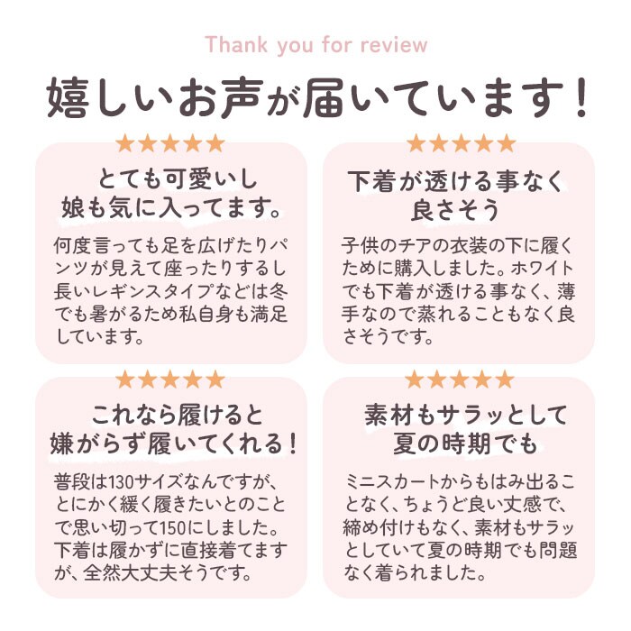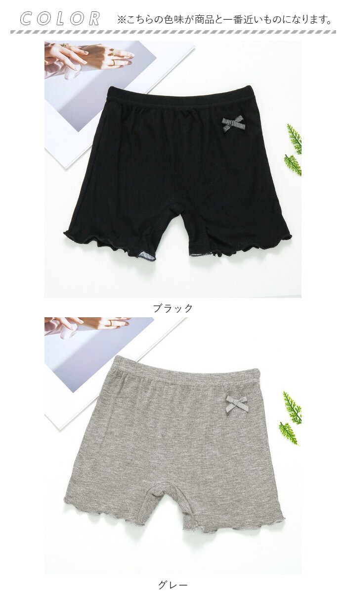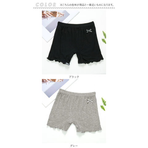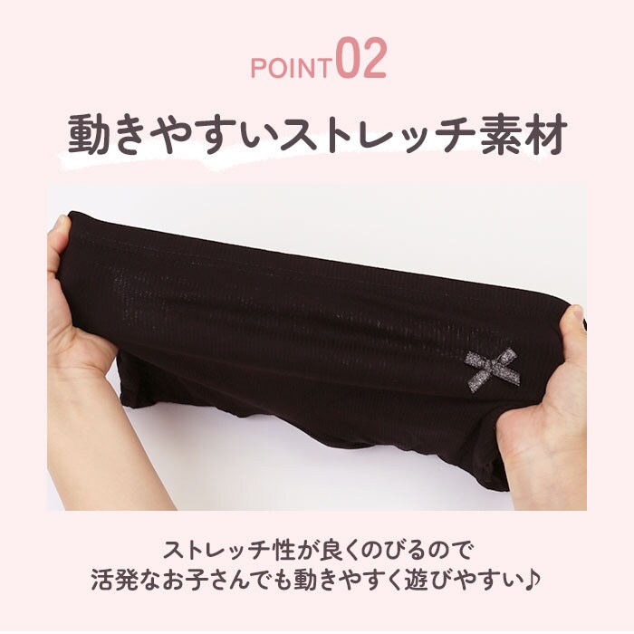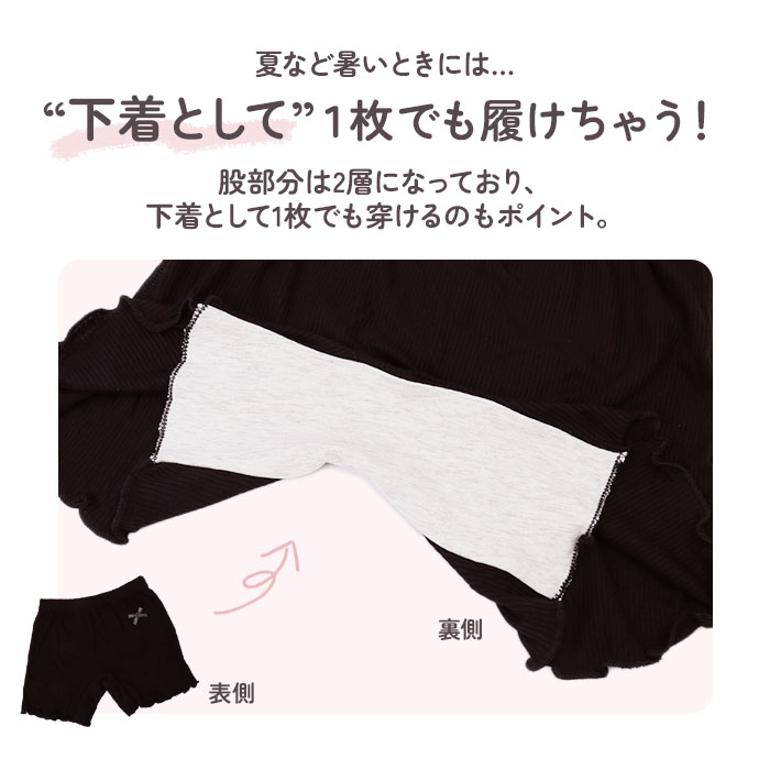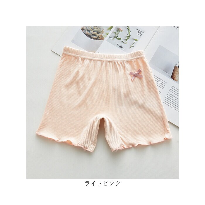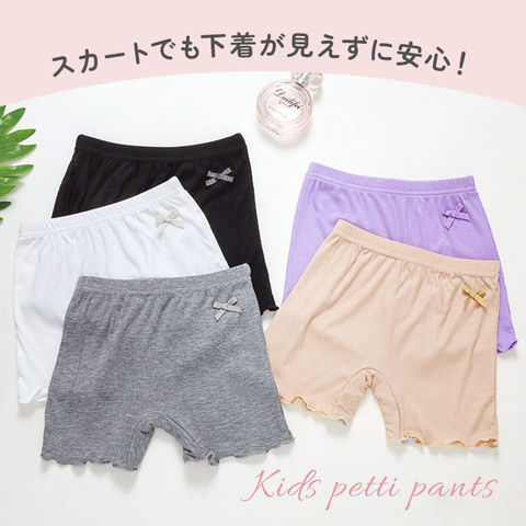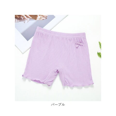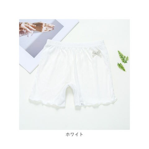 | 商品説明 | 薄手で着心地の良い女の子用のペチパンツが発売。ワンピースやスカートの下に穿いて下着が見えるのをガード。股部分は2層になっており、下着として一枚でも穿けるのもポイント。そのまま穿いても肌が透けない◎(※ホワイトカラーは透ける場合がございます。)ストレッチ性が良く活発なお子さんでも動きやすく遊びやすい♪幼稚園の制服とも合わせられるシンプルなデザイン!女の子に嬉しいラメリボン付き。 |