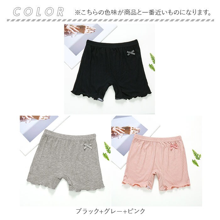 | 商品説明 | 薄手で着心地の良い女の子用のペチパンツが3枚セットで発売。ワンピースやスカートの下に穿いて下着が見えるのをガード。股部分は2層になっており、下着として一枚でも穿けるのもポイント。そのまま穿いても肌が透けない◎(※ホワイトカラーは透ける場合がございます。)ストレッチ性が良く活発なお子さんでも動きやすく遊びやすい♪幼稚園の制服とも合わせられるシンプルなデザイン!女の子に嬉しいラメリボン付き。 |