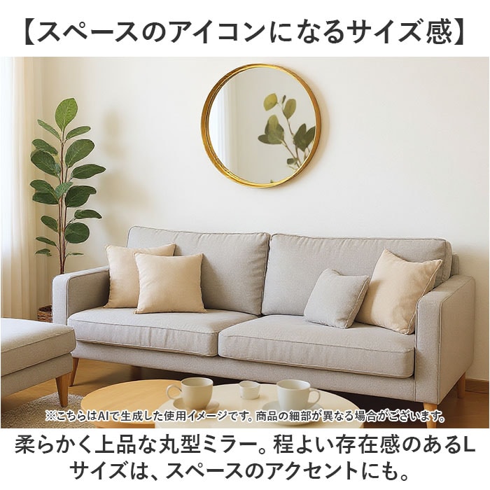 | 商品説明 | 【光と奥行きを与えるミラー】空間を明るく広く♪身だしなみチェックなどにも!Grocia メタルラウンドミラー L。【スッと溶け込む洗練された仕上がり】柔らかな光沢をもつ、アルミ製の奥行があるフレーム。主張しすぎず程よく個性的でエレガント。【光を反射し、空間に温かみをプラス】フレームが光を反射し、お部屋全体を明るく演出♪自然光や人工光を受けて輝く!【お肌の見え方も明るくキレイに】ミラーは反射率の高い、日本製の銀引鏡板。明るく、歪みのない見た目に近い反射を映し出す♪【安心して使える飛散防止加工済み】万が一ミラーが破損した場合も、破片が飛び散りにくい仕様。事故やケガのリスクを軽減◎【壁に簡単に設置できて便利】背面のフックを使って、サクッと壁掛け。吊り下げ用の紐も1本付属。【スペースのアイコンになるサイズ感】柔らかく上品な丸型ミラー。程よい存在感のあるLサイズは、スペースのアクセントにも。 |