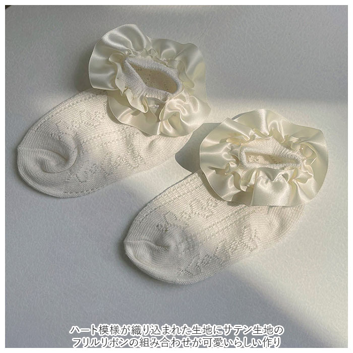 | 商品説明 | サテン生地のリボンが華やかなアクセントに♪女の子用 フォーマル靴下が発売。無駄のないシンプルなデザインで、発表会や卒園卒業式等のフォーマルシーンにピッタリ!ハート模様が織り込まれた生地にサテン生地のフリルリボンの組み合わせが可愛いらしい作り。フォーマルシーンはもちろん、デイリー使いにもおススメなアイテム。 |