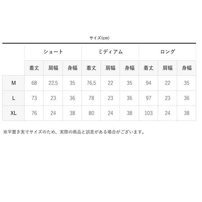 | サイズ | [サイズ] ・Mサイズ ・Lサイズ ・XLサイズ [丈の長さ] ・ショート ・ミディアム ・ロング ※サイズについて詳細は、サイズ表をご覧くださいませ。 |