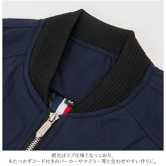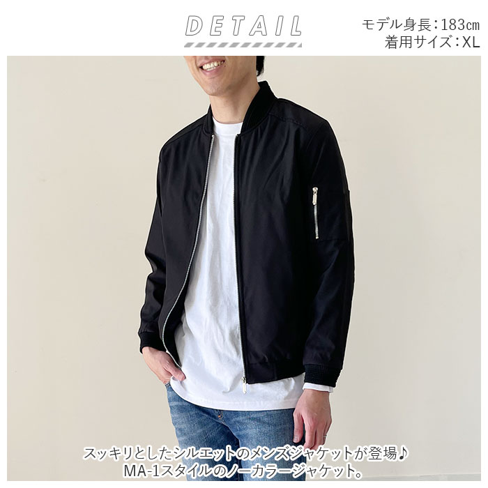 | 商品説明 | スッキリとしたシルエットのメンズジャケットが登場♪MA-1スタイルのノーカラージャケット。襟元はリブ仕様となっており、もたつかずフード付きのパーカーやマフラー等と合わせやすい作りに。さらに袖口とジャケットの裾のリブ生地が手首や身体のラインに優しくフィットして、暖かい空気をしっかりキープ!ポケットは左右×1、左の内側×1、左腕部にペン挿し×2、ファスナーポケット×1装備。普段使いはもちろん、ポケットがたくさんあるので仕事着にもおススメ!ジーンズやチノパンなどシンプルなボトムスと合わせれば、リラックス感のあるカジュアルコーデが即完成!秋冬時期の軽快な大人カジュアルを素敵に楽しめるアイテム♪ |