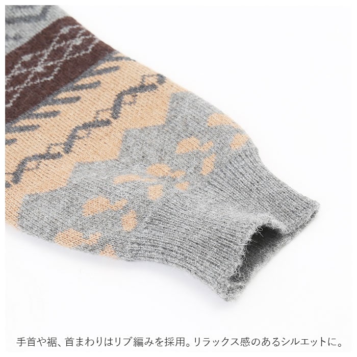 | 商品説明 | 秋冬にピッタリなノルディック柄ニットセーターが新登場。落ち着いた派手過ぎない色合いのノルディック柄がおしゃれにキマる♪ニット生地で程よい厚手の生地感。重ね着もしやすくロングシーズン着まわせるアイテム。首元はスッキリとしたラウンドネック。手首や裾、首まわりはリブ編みを採用。リラックス感のあるシルエットに。カジュアルで様々なコーデに合う可愛いニットセーター♪ |