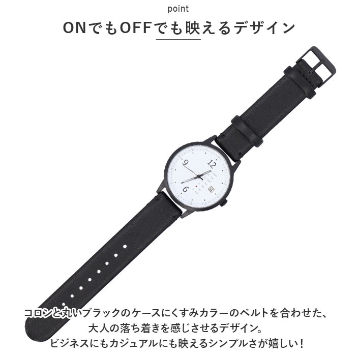| 商品説明 | シンプルで大きめの文字盤が、手元の素敵なアクセントに。見やすいカレンダー機能付き「腕時計 ドリエ」が新登場。【ONでもOFFでも映えるデザイン】コロンと丸いブラックのケースにくすみカラーのベルトを合わせた、大人の落ち着きを感じさせるデザイン。ビジネスにもカジュアルにも映えるシンプルさが嬉しい!【アナログウォッチフェイス】ホワイトの文字盤にインデックスバーを控えめに並べたシンプルなアナログウォッチフェイス。ベゼル内側の立体感のある「分数・秒数スケール」が個性的。【直観的に見やすいカレンダー付き】その日の予定がスムーズに確認できる、日付・曜日カレンダー付き。縦一列に並んだ曜日表記に小さな赤い丸が灯るから、直観的で見やすいのがポイント!【日本製ムーブメント】静かに正確な時を刻む。確かな性能を誇る、安心と信頼の日本製高性能ムーブメントを採用。【ユニセックスデザイン】くすみカラーのフェイクレザーベルトが手首に優しく馴染む・・・。着用する人の性別やファッションを選ばない、ボーダーレスなカラーとデザインも魅力のひとつ。 |