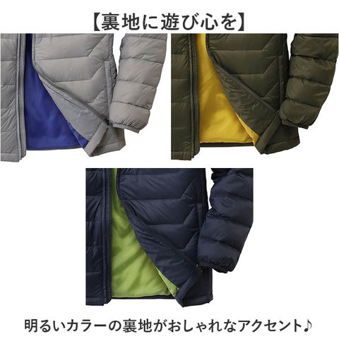 | 素材 | [表地]ナイロン100% [裏地](身頃)ポリエステル100%、(袖)ナイロン100% [充填物](衿、前後身頃、袖)ダウン90%、フェザー10% [中わた](前身端、下前立て、ポケット口)ポリエステル100% |
