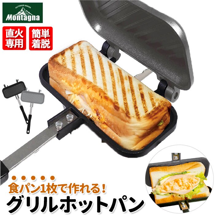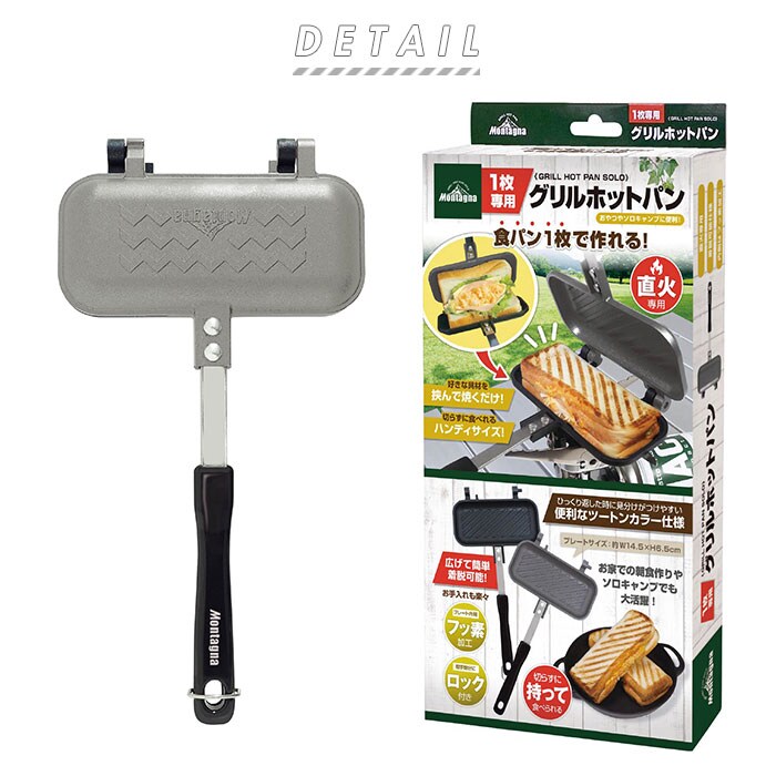 | 商品説明 | お家での朝食やソロキャンプで大活躍♪グリルホットパン(1枚用)が登場!油を薄く引いたプレートに食パンを置き、お好きな具材を挟んで焼くだけ!ホカホカの美味しいホットサンドが手軽に作れるグリルパン。(※直火専用です。)食パン1枚で焼き上げるから、1人でもちょうど良いボリューム感。切らずに持って食べられるハンディサイズなのが嬉しい♪ひっくり返した時に焼き目の見分けがつけやすい、ツートンカラー仕様◎プレート面を外側に広げてスライドさせることで、簡単に着脱が可能。ミニフライパンとして使ってもOK。内面は汚れが落としやすくお手入れが楽ちんな、フッ素加工済み。ハンドルロック付きだから、使用時や収納時も安心!コンパクトで軽量なグリルパンは、持ち運びにも便利。 |