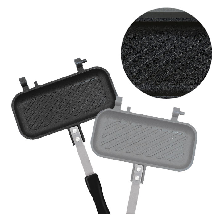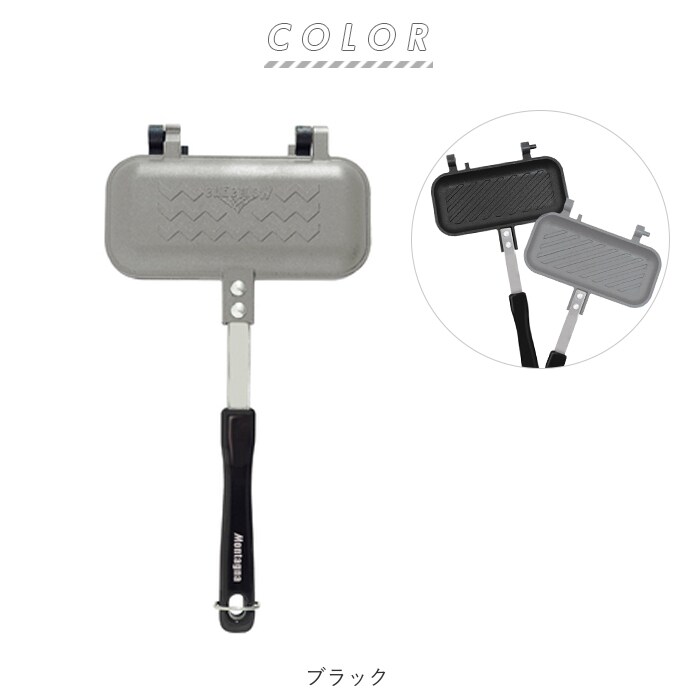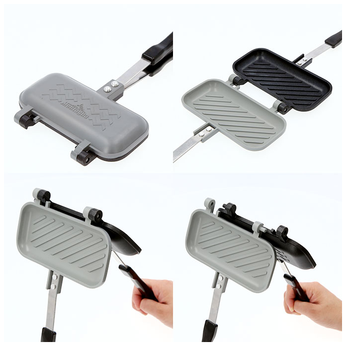 | 注意点 | 焼き時間は目安です。焼き目や食材の火の通り具合が足りない場合は再度加熱してください。本製品は直火専用になります。コンロを使用しIHや電子レンジ等は絶対に使用しないでください。直火で熱するので調理中・調理後はプレート面が大変熱くなります。また、取手が熱くなる場合があります。必ずミトンやふきんなどをご使用して火傷に注意ください。小さなお子様がいる場合は、調理中に本体や火気に近づかないように注意して目を離さないでください。ご購入後、初めて使用される際は、スポンジ等に食器用洗剤をつけて洗い水気を十分に取り乾かしてからご使用ください。製品の品質には万全を期しておりますが、製造工程上やむなく汚れ・バリ・キズが多少残ってしまう場合があります。ご使用前にご確認ください。本製品は、一般家庭用です。業務用としては使用しないでください。空焚きはしないでください。プレート内側のフッ素樹脂加工の損傷や本体の変形や破損・火災・火傷の原因となります。使用時は、本体に付いている水滴などをしっかり拭き取り、取手は必ずロックした状態にしてください。フッ素樹脂加工を長持ちさせる為には、火力を中火以下で使用してください。食材を調理する際はプレート内側に薄く油を引いてから使用してください。また、金属製のヘラなどは使用しないでください。表面を傷つける原因となります。食材を入れすぎると、挟みこむ際にはみ出したり、調理中に噴きこぼれる場合があります。食材に合わせて量を調節してください。必ずプレート面がコンロの中央にくるように置き、安定させて使用してください。炎がプレート面からはみ出さないように火の加減を注意してください。はみ出したまま使用すると取手が熱くなったり、変形や破損の原因となります。2口以上のコンロで使用する際は、隣接するコンロの炎が取手に当たらないよう取手の向きに注意してください。調理後に器として使用する際は、火傷などに十分ご注意ください。また保存容器として使用しないでください。錆の原因となりますので他の容器に移してください。調理した食材は、できるだけ早めにお召し上がりください。水や油などの液体を入れて使用しないでください。天ぷら料理等油を大量に使う料理には使用しないでください。また、強火で炒め物を作らないでください。焼けて変形する原因になります。ストーブの上では危険ですので使用しないでください。使用直後に冷水をかけるなど急激な温度変化を与えないでください。分解・改造などしないでください。投げる・ぶつける・振り回すなど乱暴に扱い、強い衝撃を与えないでください。ひび割れなどの変形・破損があった場合は、直ちに使用を中止してください。使用後は、汚れが付着した状態で放置せず、お手入れ方法に従って片付けを行い高温・多湿な場所を避けて、小さなお子様の手の届かないところに保管してください。カメラやモニターの性質により、画像と実物の色の違いがある場合がございますのでご理解願います。 |