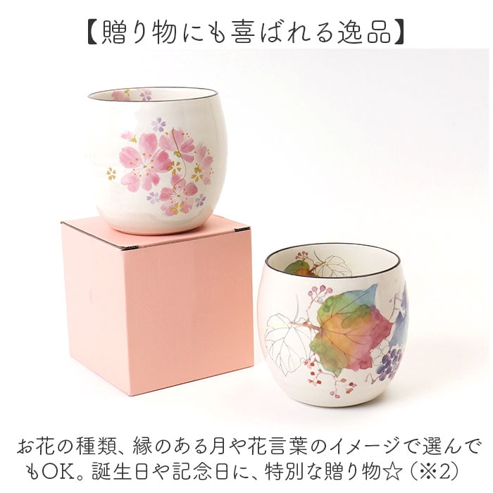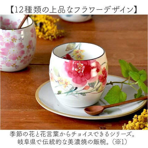 | 商品説明 | 【特別感のある可愛らしいアイテム】季節のお花を取り入れた「花ものがたり 12ヶ月丸型カップ」安心の日本製。【12種類の上品なフラワーデザイン】季節の花と花言葉からチョイスできるシリーズ。岐阜県で伝統的な美濃焼の飯椀。 (※1)土を主成分とする陶器製のため、風合いなどに個体差があります。【手にしっくり馴染む丸型】程よい深さで女性の手で包み込みやすいフォルム。【電子レンジ対応】電子レンジでの温め直しOK。使い勝手の良さも魅力の1つ♪【贈り物にも喜ばれる逸品】お花の種類、縁のある月や花言葉のイメージで選んでもOK。誕生日や記念日に、特別な贈り物☆ (※2)花言葉は、画像にてご確認ください。 |