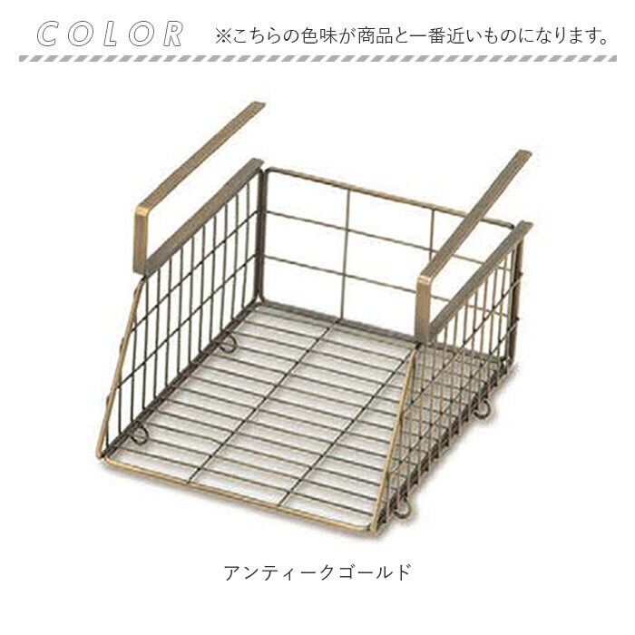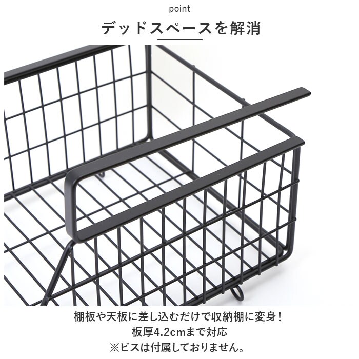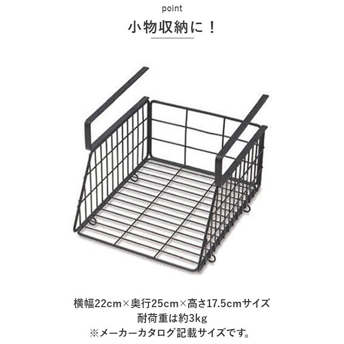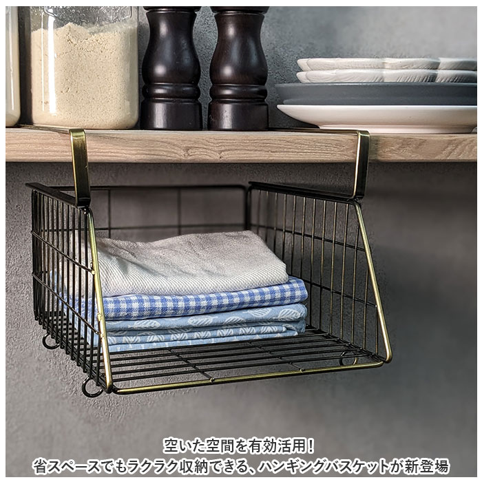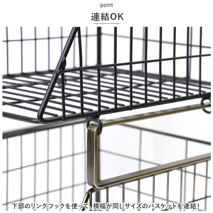 | 商品説明 | 空いた空間を有効活用!省スペースでもラクラク収納できる、ハンギングバスケットが新登場。【小物収納に!】横幅22cm×奥行25cm×高さ17.5cmサイズ。耐荷重は約3kg。(※メーカーカタログ記載サイズです。)【デッドスペースを解消】棚板や天板に差し込むだけで収納棚に変身!板厚4.2cmまで対応。(※ビスは付属しておりません。)【連結OK】下部のリングフックを使って、横幅が同じサイズのバスケットを連結!クロスやマグなどを、取り出しやすく収納できて便利。【シンプルなデザイン】アンティーク感たっぷりのアイアン素材を使用。どんなテイストのお部屋にも馴染みやすい、生活感を抑えた仕上がり。【見せる壁面収納!】キッチンやリビング、玄関先で!小物をすっきり整理整頓♪ |