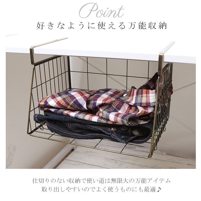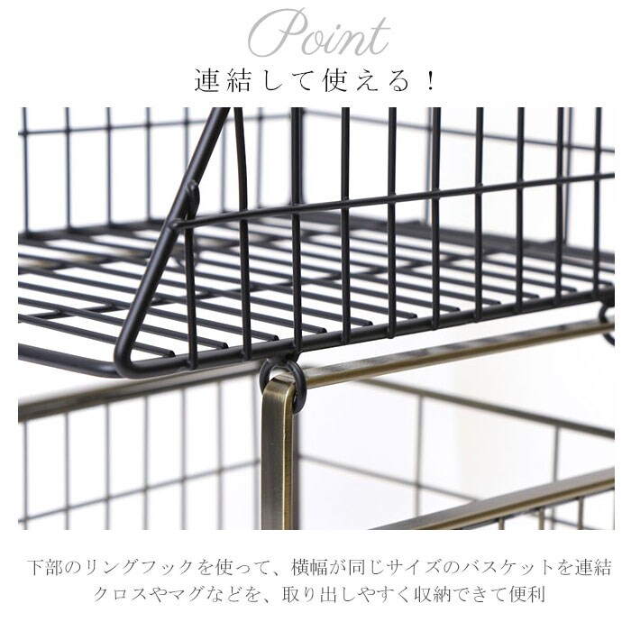 | 商品説明 | 空いた空間を有効活用!省スペースでもラクラク収納できる、ハンギングバスケットが新登場。【小物収納に!】横幅36.5cm×奥行25cm×高さ25cmサイズ。耐荷重は約3kg。(※メーカーカタログ記載サイズです。)【デッドスペースを解消】棚板や天板に差し込むだけで収納棚に変身!板厚4.2cmまで対応。(※ビスは付属しておりません。)【連結OK】下部のリングフックを使って、横幅が同じサイズのバスケットを連結!クロスやマグなどを、取り出しやすく収納できて便利。【シンプルなデザイン】アンティーク感たっぷりのアイアン素材を使用。どんなテイストのお部屋にも馴染みやすい、生活感を抑えた仕上がり。【見せる壁面収納!】キッチンやリビング、玄関先で!小物をすっきり整理整頓♪ |