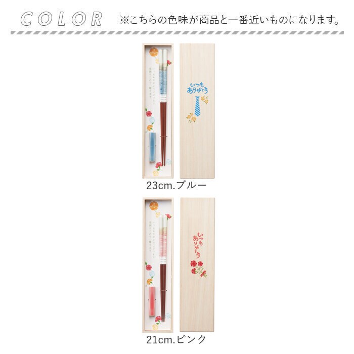 | サイズ | 【箸】 ・23cm.ブルー [長さ]約23cm ・21cm.ピンク [長さ]約21cm 【箸置き】(※両カラー共通サイズ) [縦]約0.9cm/[横]約1.3cm/[奥行]約5.6cm ※サイズは当店計測の実寸サイズです。実際の商品ならびにメーカー表記サイズとは多少の誤差が生じる場合がございます。あらかじめご了承ください。 |