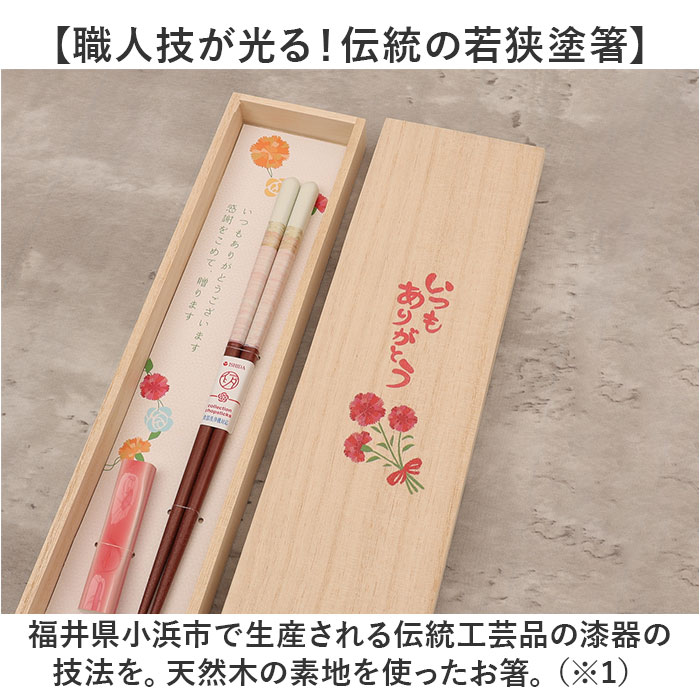 | 商品説明 | 【大切な方へありがとうの贈り物】食卓に彩りをプラス♪桐箱&箸置き付きの「メッセージ箸」が新登場。【職人技が光る!伝統の若狭塗箸】福井県小浜市で生産される伝統工芸品の漆器の技法を。天然木の素地を使ったお箸。(※1)お箸の表面に塗装を施しております。【食材をしっかりキャッチ】天然木の素地を使用した箸先には、滑り止め加工済み。食材をつかみやすい仕上がり。【使いやすいシンプルな箸置き】お手持ちのお箸とも合わせやすい、ベーシックな形。天然木に塗装を施し、軽やかな仕上がり。【食洗機対応でお箸を簡単お手入れ】お箸は食洗機の使用OK。お手入れしやすく、忙しい毎日の味方◎【My箸で地球に優しくエコ】割り箸を使う頻度を減らすことで、サスティナブルな社会に貢献。【特別な日の贈り物にぴったり】桐箱&気持ちが伝わるメッセージ入り♪母の日や父の日など、感謝を伝えたい日のギフトに。(※2)カラーにより、お箸の長さが異なります。 |