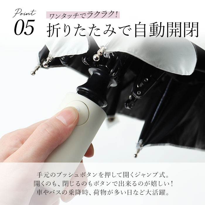| 商品説明 | 【機能性もデザイン性もアリ】雨晴兼用と可愛いデザイン性がポイント☆親骨55cmの自動開閉折り畳み傘がHAUから発売【片手で操作できる自動開閉】手元のプッシュボタンを押して開くジャンプ式。車やバスの乗降時、荷物が多い日など大活躍!【途中で離しても安心】収納時に途中で手を離しても、シャフトが飛び出さない安全機能付き。【晴れの日の紫外線カットに】PUコーティングを施し、紫外線を99%以上カット!UPF50+効果で日焼け防止に◎【日差しをカットできる遮光効果】日差しも99%以上カットできるので熱射病対策にもオススメ♪真夏の強い日差しからも守る!【風が強い日も安心】グラスファイバーの親骨を使用し、強い風を受けてもしなやかに曲がり壊れにくい。【6本骨で軽くてスリム】親骨6本構造を採用。他の自動開閉傘と比べ骨を少なくすることで軽量&スリムな作りに。【スムーズかつ安全に開閉】開閉時に指先や爪を挟むのを防止する安全ろくろ付きで、簡単に開閉できる手開きタイプ。【大人可愛いデザイン】シンプルなホワイトと組み合わせたバイカラーデザイン!金色の刺?がちょっとしたアクセント【スーツや制服にも合う】派手すぎないカラー展開。普段の私服はもちろん、スーツや制服にも合うのも◎【収納袋までおしゃれ】金色の刺?がポイント☆オシャレなこだわりをプラスした同色の収納袋付き。 |