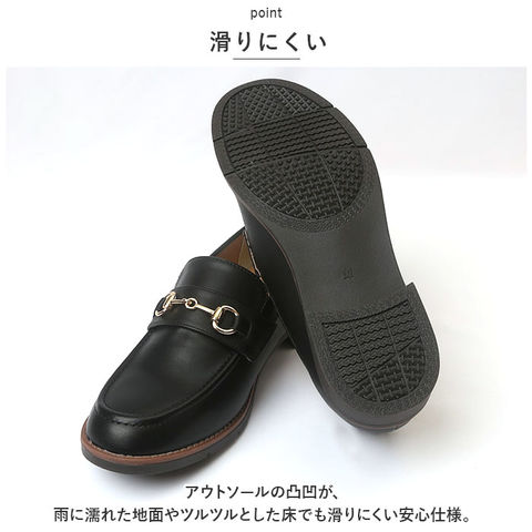 | 商品説明 | ナチュラルでリラックスできる靴つくりで評判のHashed Coorde(ハッシュドコーデ)よりカジュアルにもフォーマルにも使えるビットローファーの登場。【1足は持っておきたい】ゴールドビットがアクセント。品を持ちつつも、カジュアルに。カジュアルにもフォーマルにも合わせやすいので、1足は持っておきたいデザインが魅力。【抗菌防臭】中敷きつま先部分は抗菌加工が施され、防臭効果あり。靴の中をいつも清潔に保てるのもポイント。【滑りにくい】アウトソールの凸凹が、雨に濡れた地面やツルツルとした床でも滑りにくい安心仕様。【毎日履けちゃう!】本体素材はお手入れのしやすい合成皮革を使用。多少の雨なら気にしなくてもOKなお利口シューズだから毎日履けちゃう!(※撥水、防水ではございません。) |