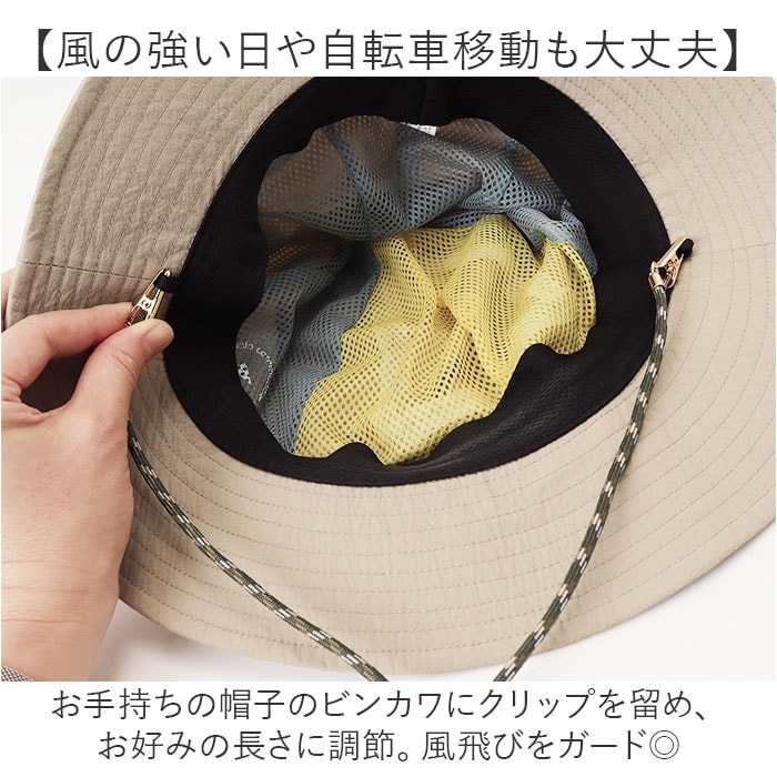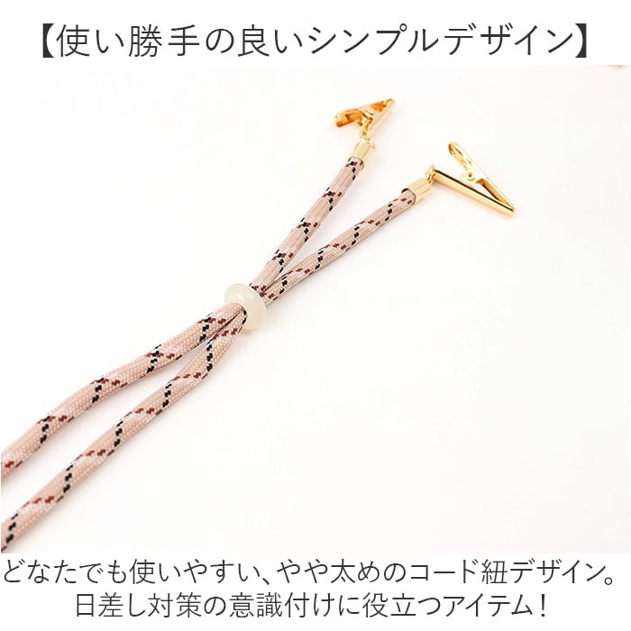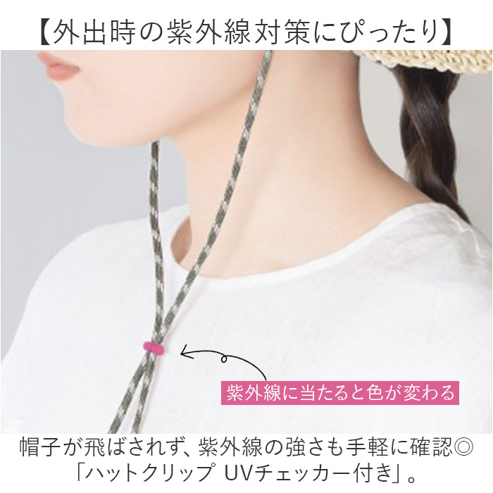 | 商品説明 | 【外出時の紫外線対策にぴったり】帽子が飛ばされず、紫外線の強さも手軽に確認◎「ハットクリップ UVチェッカー付き」。【色の変化で簡単UVチェック!】紫外線に当たると、白→薄いピンク→濃いピンクに色が変わる、ビーズの付いたハットクリップ。(※)着用位置や環境により、色変化は実際と異なる場合がございます。【風の強い日や自転車移動も大丈夫】お手持ちの帽子のビンカワにクリップを留め、お好みの長さに調節。風飛びをガード◎【使い勝手の良いシンプルデザイン】どなたでも使いやすい、やや太めのコード紐デザイン。日差し対策の意識付けに役立つアイテム! |