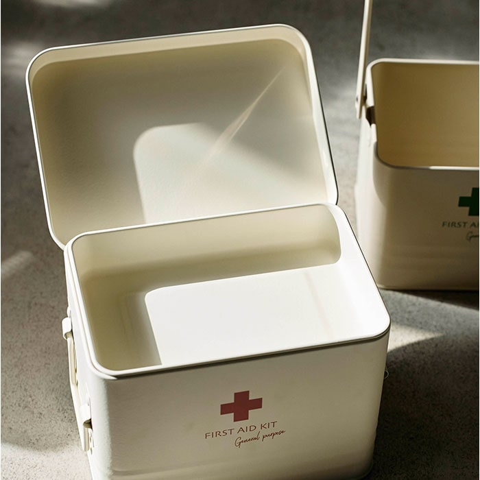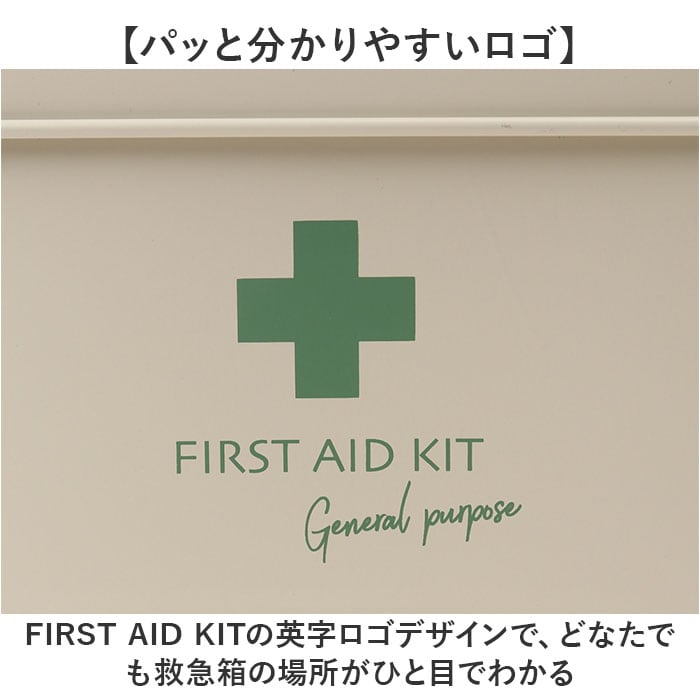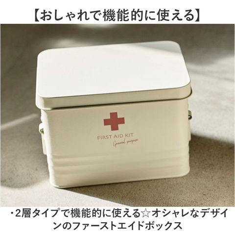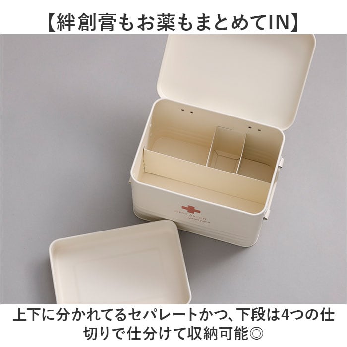 | 商品説明 | 【おしゃれで機能的に使える】・2層タイプで機能的に使える☆オシャレなデザインのファーストエイドボックス【絆創膏もお薬もまとめてIN】上下に分かれてるセパレートかつ、下段は4つの仕切りで仕分けて収納可能◎【箱や瓶に入った薬も収納可能】下段は深さがあり、瓶や箱のパッケージにも対応ができるのも嬉しいポイント。【スタイリッシュで長く使える】スチール製でスタイリッシュな仕上がりと、プラスチック製と比べて壊れにくいのもポイント。【持ち運び楽々】両サイドに持ち手付きで、持ち運びにも便利。怪我をした時にもサッと持ち出せる。【インテリアにもマッチ】アイボリーのワンカラーにくすみカラーのロゴをプラス。インテリアにも馴染む見た目☆【パッと分かりやすいロゴ】FIRST AID KITの英字ロゴデザインで、どなたでも救急箱の場所がひと目でわかる |