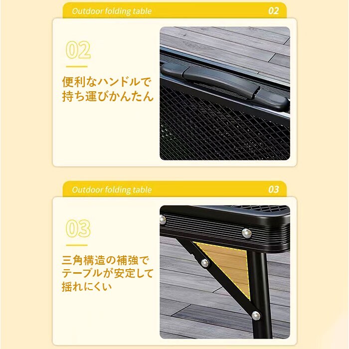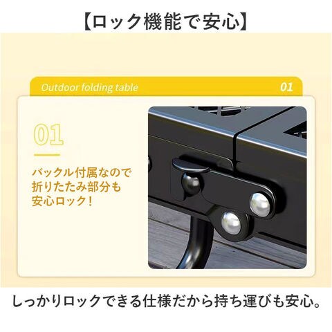 | 商品説明 | 【アウトドアの必需品】コンパクト収納で持ち運び楽々、便利な折り畳みテーブル。【折りたたみ式で収納】使わない時はコンパクトに折りたためて場所を取らない便利な設計♪【持ち運びが楽々】収納袋付きだからキャンプやピクニックへの持ち運びもスムーズ◎【ロック機能で安心】しっかりロックできる仕様だから持ち運びも安心。【軽量アルミ素材】アルミ合金製で軽いのに丈夫で、アウトドアシーンで大活躍! |