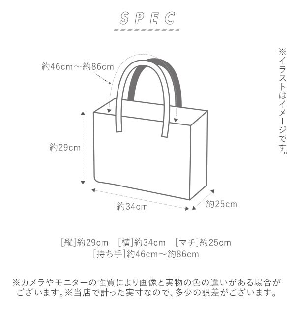 | サイズ | [縦]約29cm [横]約34cm [マチ]約25cm [持ち手]約46~約86cm(調節可能) ※サイズは当店平置き実寸サイズです。実際の商品とは多少の誤差が生じる場合がございます。あらかじめご了承ください。 |