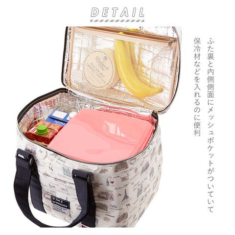 | 注意点 | 持ち手を強く引っ張ったり、重たいものを詰め込み過ぎて使用すると破損する恐れがあります。ご注意ください。内側に保冷・保温効果を保つための材質を使用しておりますが、あくまでも簡易的なものなので、冷やす効果はありません。要冷蔵の食べ物や飲み物等を長時間入れたままにしないでください。外気温により保冷効果は異なります。この製品は防水加工商品ではありません。凍らせたものを入れると結露した水が縫製部分より外側へ染み出すことがあります。お洗濯はお避けください。カメラやモニターの性質により、画像と実物の色の違いがある場合がございますのでご理解願います。 |