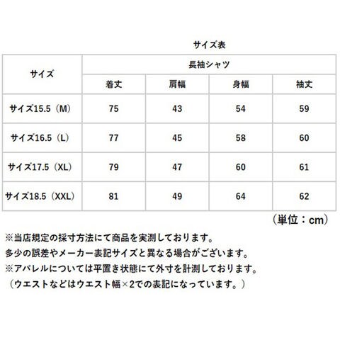 | サイズ | [メンズ] ・サイズ15.5(M) ・サイズ16.5(L) ・サイズ17.5(XL) ・サイズ18.5(XXL) ※サイズについて詳細は、商品画像の中にあるサイズ表をご覧くださいませ。 |