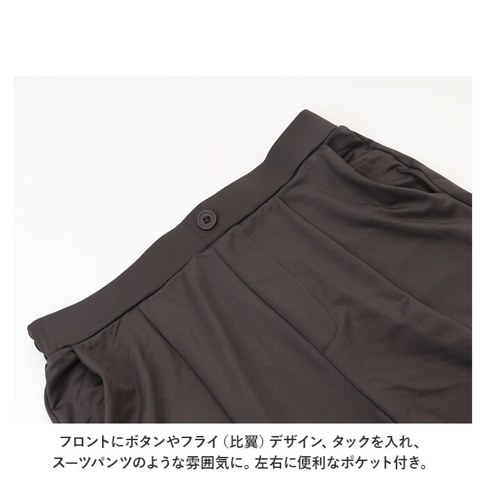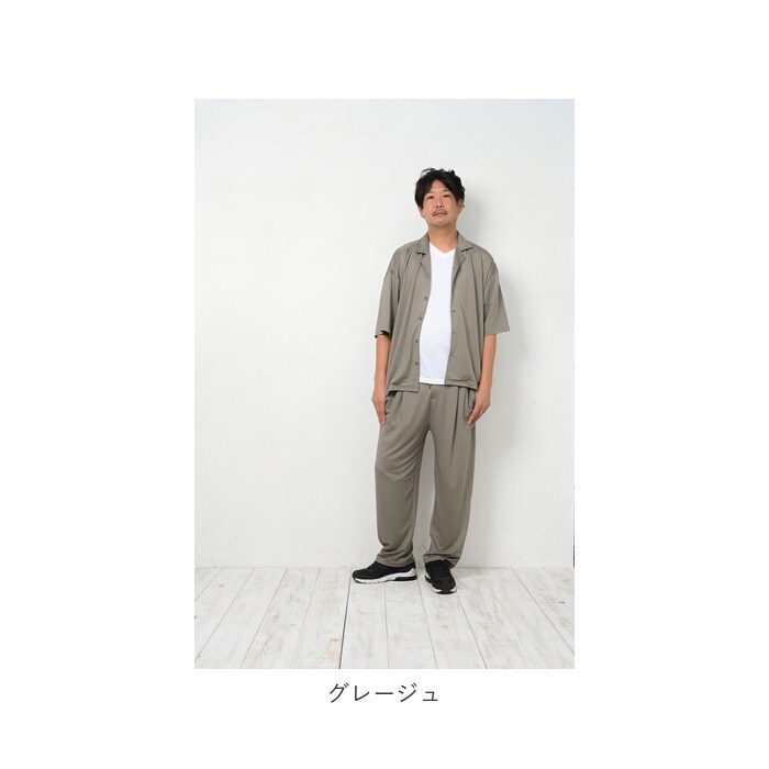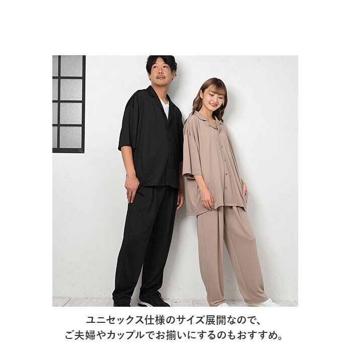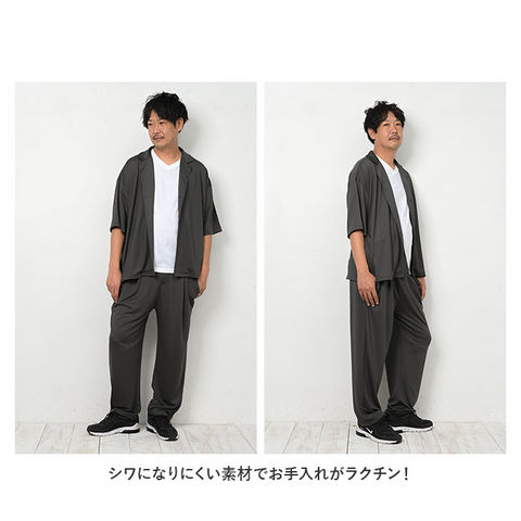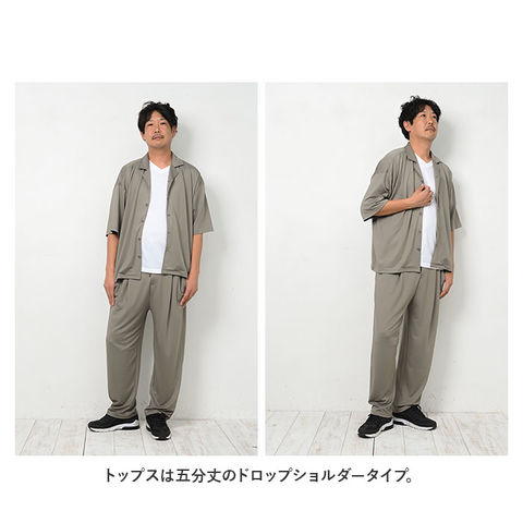 | 商品説明 | カジュアルさの中にきちんと感をプラス!オープンカラーセットアップが新登場。ゆったりとしたシルエットで、ストレスフリーな着心地!水滴をサッと弾く高撥水生地を使用。約100回洗濯しても、撥水効果が持続◎(※濡れた状態で放置することはお避けください。)シワになりにくい素材でお手入れがラクチン!トップスは五分丈のドロップショルダータイプ。胸元の通気性がよく涼しさを確保できる、オープンカラーデザイン。首元が詰まったデザインが苦手な方にもぴったり。ボトムスは締めつけ感のないウエストゴム(バックギャザーゴム)仕様。紐でサイズ調節も可能。フロントにボタンやフライ(比翼)デザイン、タックを入れ、スーツパンツのような雰囲気に。左右に便利なポケット付き。ルームウェア、旅行時のリラックスウェアとして大活躍!テレワーク用にもぴったり。ユニセックス仕様のサイズ展開なので、ご夫婦やカップルでお揃いにするのもおすすめ。予備ボタン×2が付属。 |