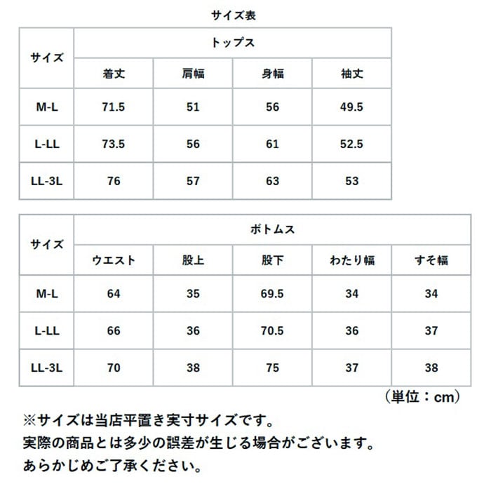 | 重量 | 約680g(※L-LLサイズ上下セットの商品の重量です。) |