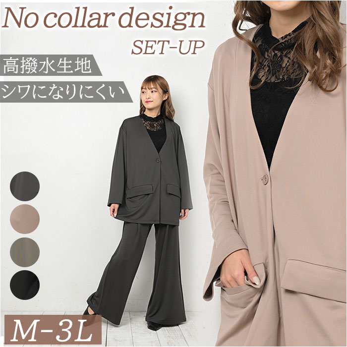 高撥水 レディース ノーカラー セットアップ【グレージュ】【LL-3Lサイズ】