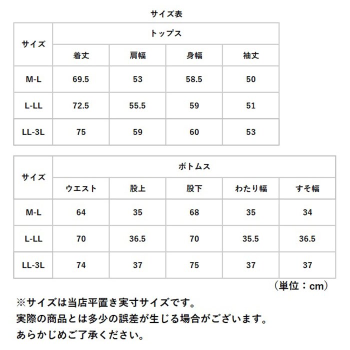 | サイズ | [レディース] ・M-Lサイズ ・L-LLサイズ ・LL-3Lサイズ ※サイズについて詳細は、商品画像の中にあるサイズ表をご覧くださいませ。 |