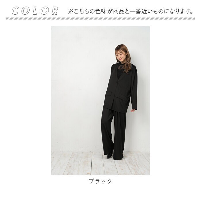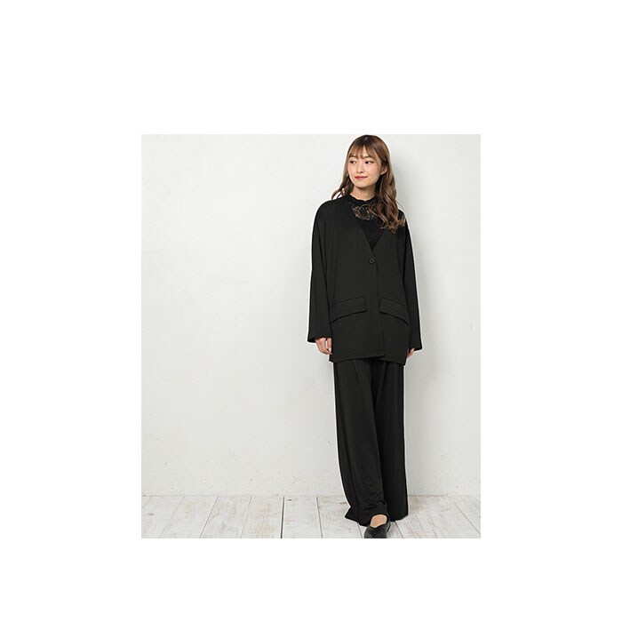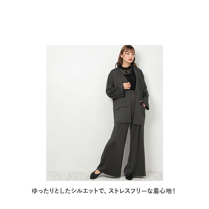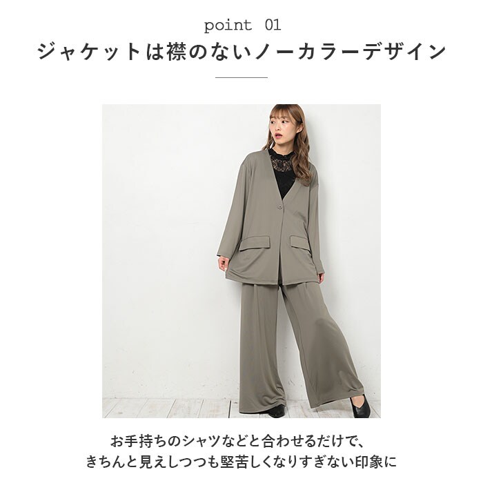 | 商品説明 | カジュアルさの中にきちんと感をプラス!レディース用ノーカラーセットアップが新登場。ゆったりとしたシルエットで、ストレスフリーな着心地!水滴をサッと弾く高撥水生地を使用。約100回洗濯しても、撥水効果が持続◎(※濡れた状態で放置することはお避けください。)シワになりにくい素材でお手入れがラクチン!ジャケットは襟のないノーカラーデザイン。お手持ちのシャツなどと合わせるだけで、きちんと見えしつつも堅苦しくなりすぎない印象に。左右にはポケットを配置。ボトムスは気になる太ももまわりをカバーできるワイドタイプ。締めつけ感のないウエストゴム(バックギャザーゴム)仕様。トップスをインしても、フロントからの見た目がスッキリ◎左右にポケット付き。ルームウェア、旅行時のリラックスウェアとして大活躍!テレワーク用にもぴったり。予備ボタン×1が付属。 |