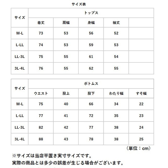 | 重量 | 【トップス】約320g 【パンツ】約323g (※L-LLサイズの商品の重量です。) |