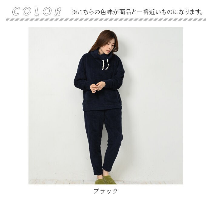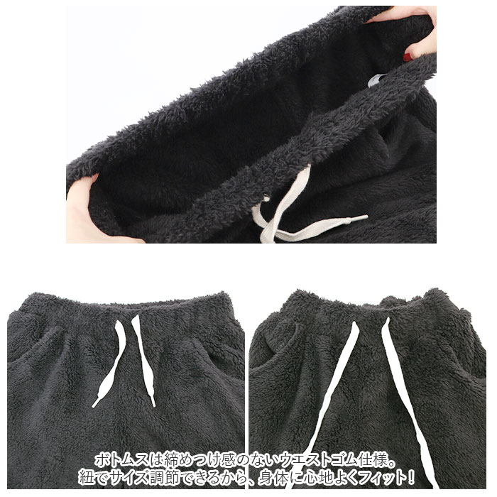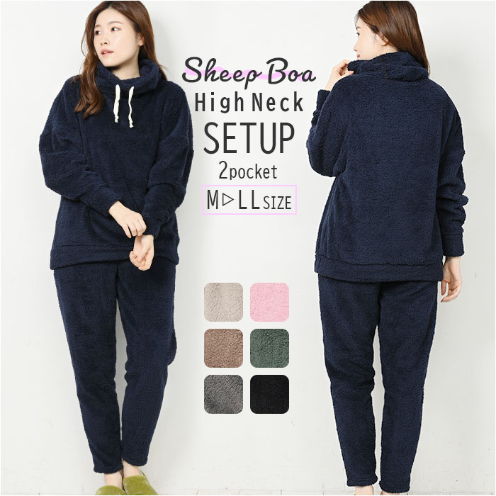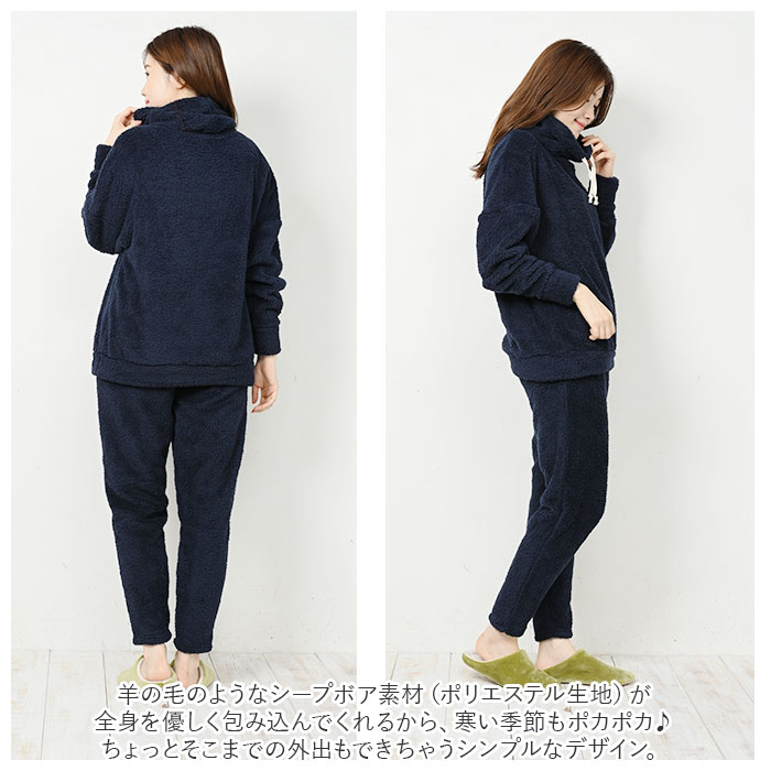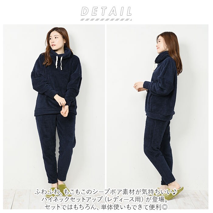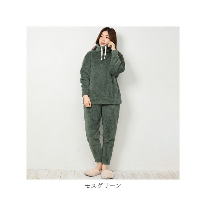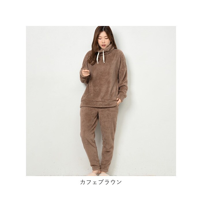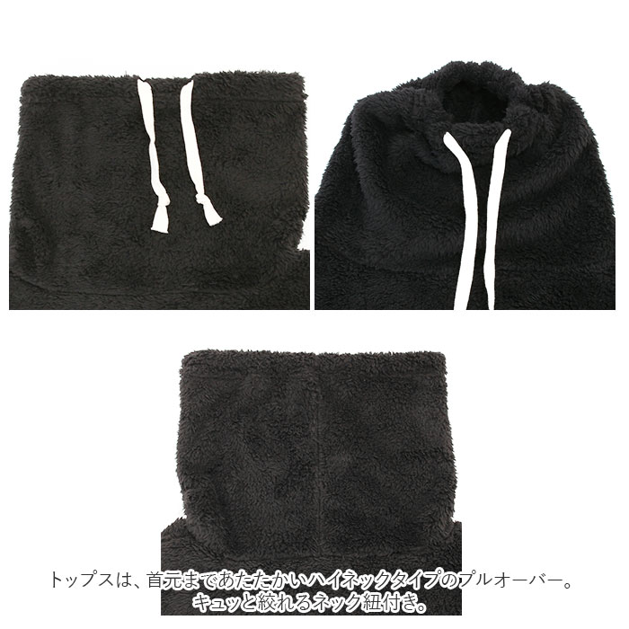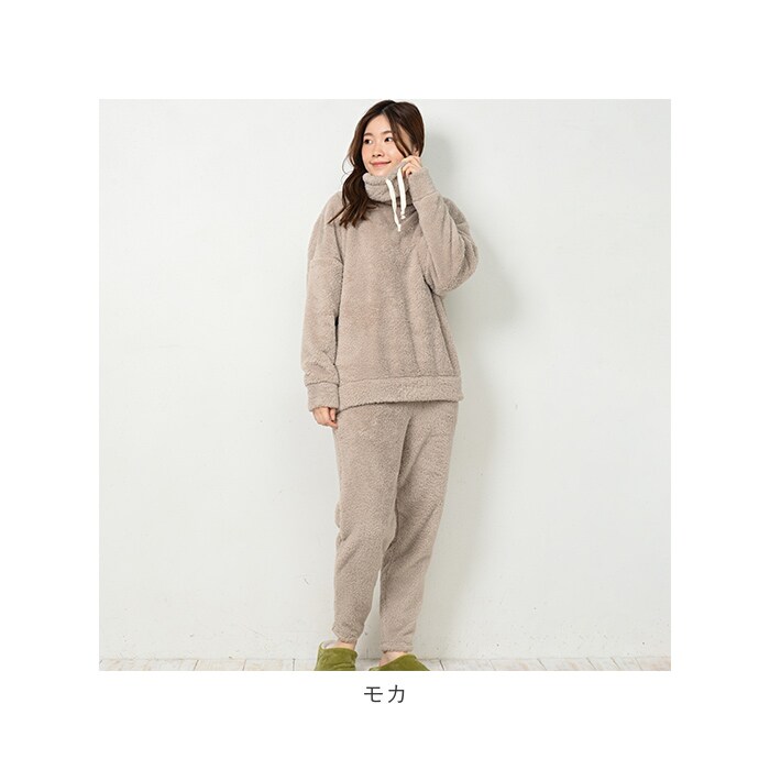 | 商品説明 | ふわふわ、もこもこのシープボア素材が気持ちいい♪ハイネックセットアップ(レディース用)が登場。羊の毛のようなシープボア素材(ポリエステル生地)が全身を優しく包み込んでくれるから、寒い季節もポカポカ♪就寝中の冷え対策、防寒用のルームウェアとして活躍!トップスは、首元まであたたかいハイネックタイプのプルオーバー。キュッと絞れるネック紐付き。ボトムスは締めつけ感のないウエストゴム仕様。紐でサイズ調節できるから、身体に心地よくフィット!左右に便利なポケット付き。セットではもちろん、単体使いもできて便利◎ちょっとそこまでの外出もできちゃうシンプルなデザイン。 |