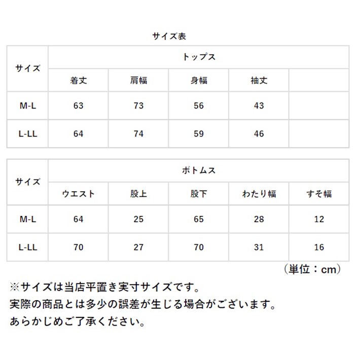 | 重量 | 【トップス】約342g 【ボトムス】約289g (※M-Lサイズの商品の重量です。) |