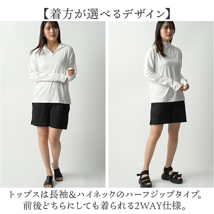| 商品説明 | 【着るだけで日焼け対策!】ラッシュガード&ショートパンツのセットアップが新登場。【しっかり紫外線カバー】紫外線防止数は最高値のUPF50+(オーストラリア・ニュージーランド基準)【ひやっ!さらっ!きもちいい♪】肌に触れるだけでひんやり冷たいQ-max0.2以上の接触冷感素材。【すぐ乾いていつでも快適!】汗をかいても乾きやすい吸水速乾機能で快適な着心地。【着方が選べるデザイン】トップスは長袖&ハイネックのハーフジップタイプ。前後どちらにしても着られる2WAY仕様。【手の甲までカバー】親指が通せるフィンガーホール付きでしっかり日焼け対策。【着脱しやすくストレスフリー】ショートパンツのウエストはゴム仕様。両サイドに便利なポケット付き。【のびのび動きやすい】縦横、四方にぐーんと伸び、ストレッチ性抜群で動きやすい。【コンパクトに持ち運べる】シワになりにくく軽くて、持ち運びもしやすい。【シンプルスタイル】シンプルなデザインとベーシックカラー。リゾートシーン以外にもデイリーに活躍♪ |