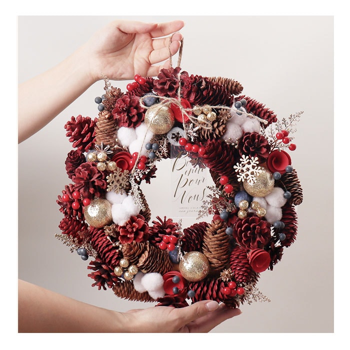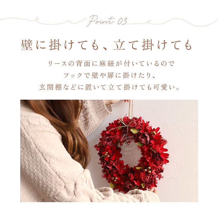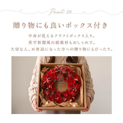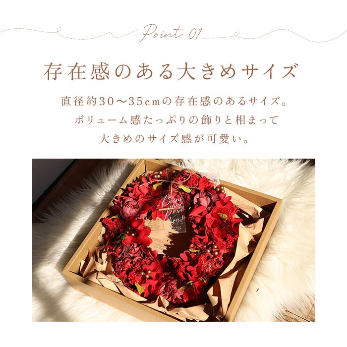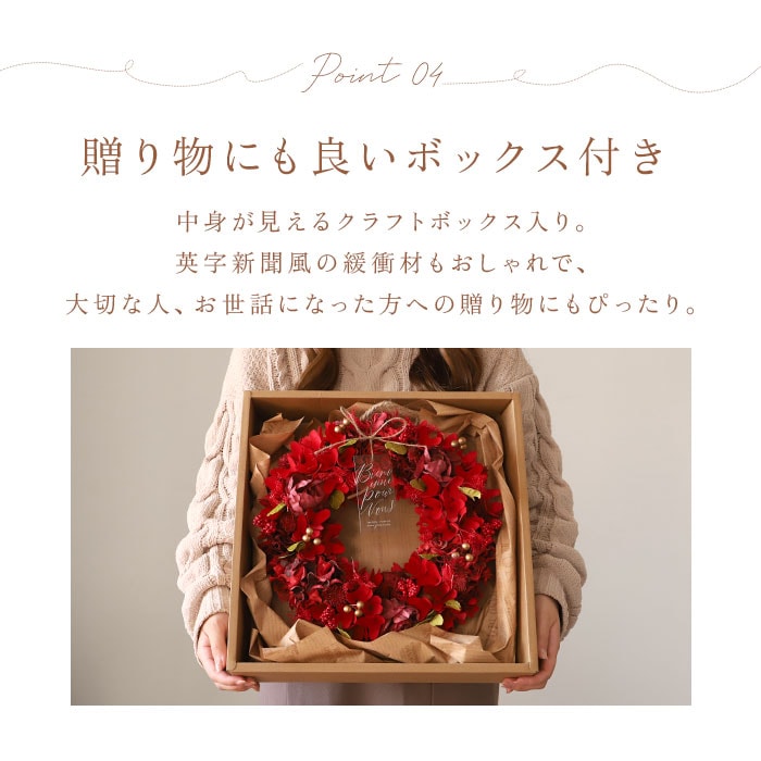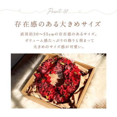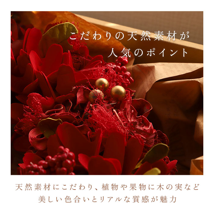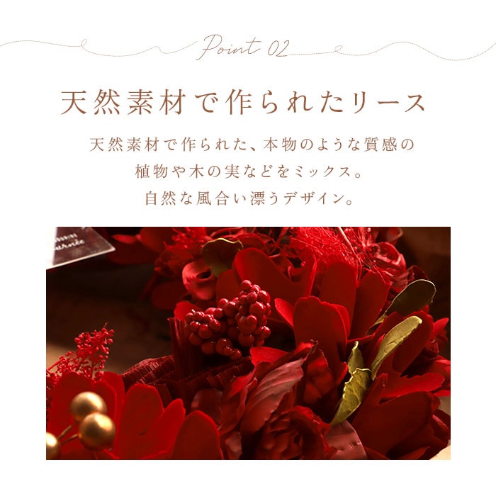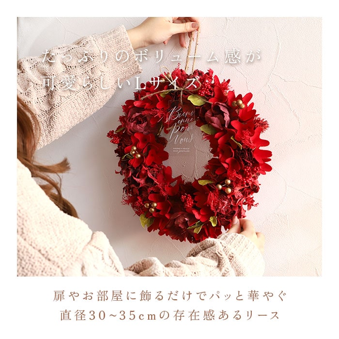 | 商品説明 | 【空間に彩りのアクセントをプラス】まるで本物の植物のような仕上がり。「ナチュラルリース」 Lサイズ。【幸運を祈る、まあるいリース】始まりも終わりもない形は「幸運がいつまでも続くように」という願いが♪【空間がパッと華やぐデザイン】天然素材で作られた植物、本物さながらの木の実をミックス☆自然な風合いを生かしたデザイン。(※)手作り品のため、個体差があります。【グッと華やぐ大きめサイズ】存在感抜群のLサイズ。広いリビングや玄関、ドアなどもおしゃれに演出するナチュラルリース。【水やり不要でお手入れラクラク】面倒なお手入れは必要なし!どなたでも気軽にお花を取り入れられるのが嬉しい♪【サッと壁掛けできて便利】背面の紐を使ってフックなどに掛けるだけ。真っ白な壁が明るい雰囲気にチェンジ。【お祝いのギフトにもおすすめ】中身が見えるクラフトボックス入り。英字新聞風の緩衝材もおしゃれで、贈り物にぴったり。 |