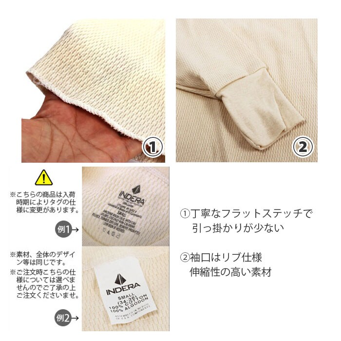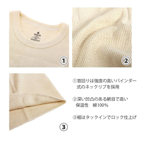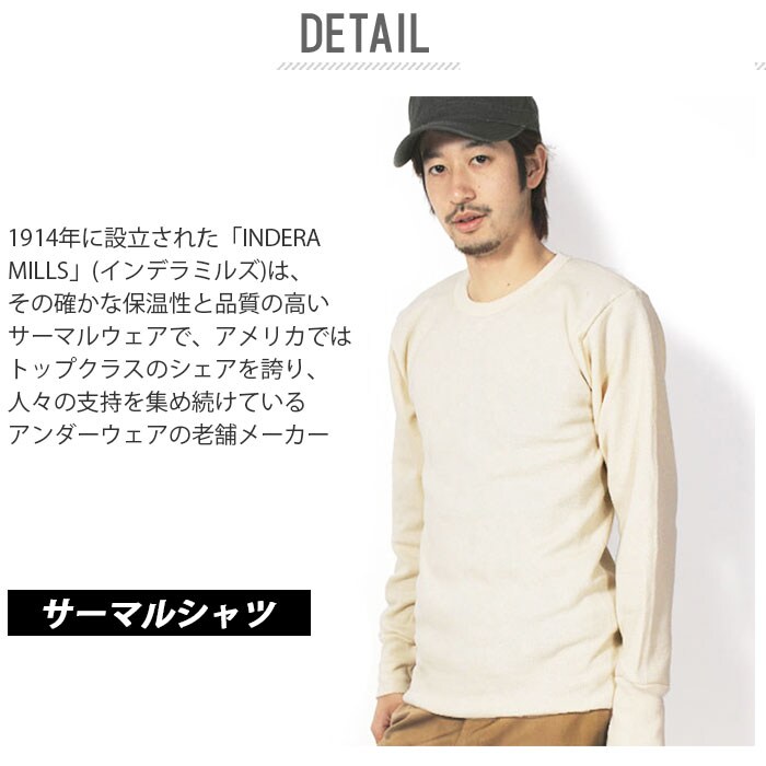 | 商品説明 | 1914年に設立された「INDERA MILLS」(インデラミルズ)は、その確かな保温性と品質の高いサーマルウェアで、アメリカではトップクラスのシェアを誇り、人々の支持を集め続けているアンダーウェアの老舗メーカー。サーマルシャツ、サーマルパンツともに良質な100%コットン素材。素材表面の凹凸部分に暖かい空気を含むことで保温性を発揮する、ラッセルニット編みの生地で仕上げており、その温かさと防寒効果は折り紙付き。ワッフル編みよりも伸縮性が高く、肌触りとフィット感も抜群!生地には適度に厚みがあり、伸縮性にも優れたクルーネックタイプのサーマルシャツは、アウターやシャツスタイルのインナーとして着用できることはもちろん、Tシャツの下に重ね着にしてもOK!サーマルパンツは、生地のゴワつきが少なく身体にしっかりとフィットするので、ボトムスの下に履いてもスタイルを崩さずスマートに着用できる。サーマルシャツパンツともに、袖口や裾は伸縮性の高いリブ仕様。身体の表面の温かな空気をしっかりと逃がさない。冷え込む寒い時期、通勤通学時のアンダーウェアとして。また、ウィンタースポーツやアウトドアでも活躍する定番アンダーウェア。 |