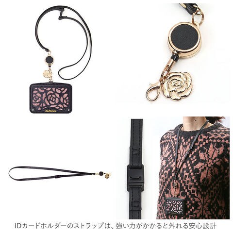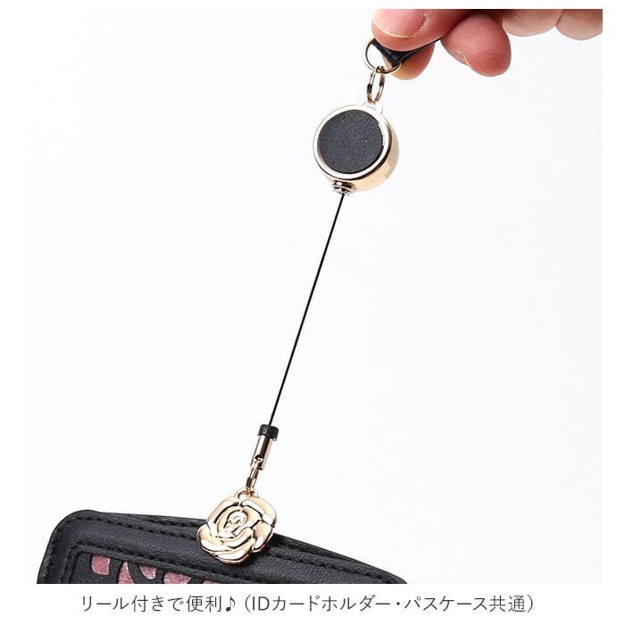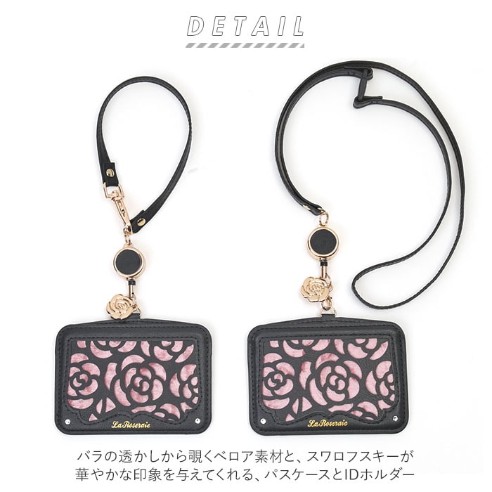 | 商品説明 | バラの透かしから覗くベロア素材と、スワロフスキーが華やかな印象を与えてくれるパスケースとIDホルダーが新登場。リールの根元部分にはゴールドのバラのチャームがついていてお洒落でエレガントに♪【IDカードホルダー】…首からぶら下げて使えるロングタイプ。リール付きだから会社の自動入場機にも引っ張るだけでタッチできる♪ストラップは強い力がかかると外れる安心設計。社員証はもちろん、保護者証を入れるのにもおすすめ。【パスケース】…リール付きだからスムーズに改札にタッチできる。エレガントなデザインでいつものカバンに付けておしゃれに通勤♪ベーシックな色合いで年代問わず使える。化粧箱に入っているので、ちょっとしたギフトにおススメ! |