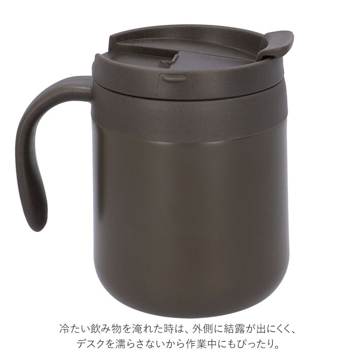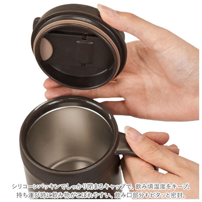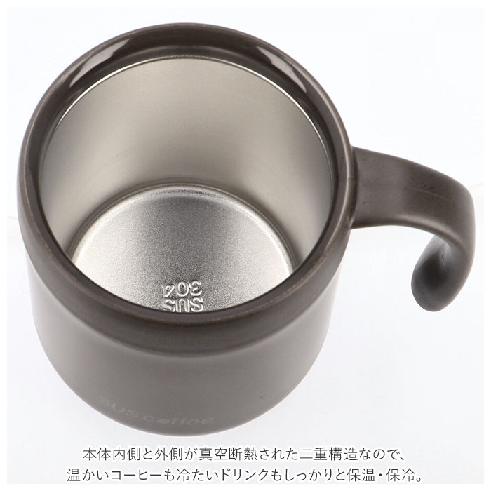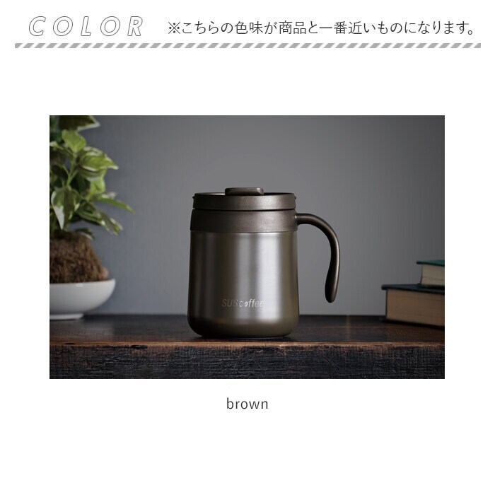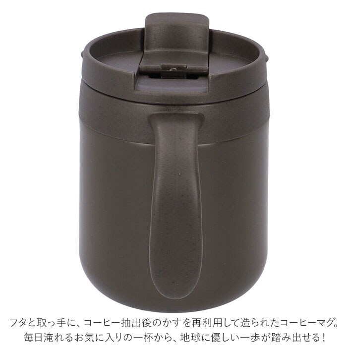 | 商品説明 | 「もっとコーヒーをサステナブルに・・・。」コーヒー好きのためのカフェ雑貨ブランド「SUS coffee」から、環境に優しいサーモマグが誕生。フタと取っ手に、コーヒー抽出後のかすを再利用して造られたコーヒーマグ。毎日淹れるお気に入りの一杯から、地球に優しい一歩が踏み出せる!本体内側と外側が真空断熱された二重構造なので、温かいコーヒーも冷たいドリンクもしっかりと保温・保冷。冷たい飲み物を淹れた時は、外側に結露が出にくく、デスクを濡らさないから作業中にもぴったり。シリコーンパッキンでしっかり閉まるキャップで、飲み頃温度をキープ。持ち運び時に飲み物がこぼれやすい、飲み口部分もピタッと密封。片手で掴んで持ちやすい取っ手と、底面にはゴムの滑り止め付きなので、ダイニングテーブルでテレワークをするときや、オフィスのデスクでも安心。お自宅やオフィスでのコーヒーブレイクにちょうどいい容量350ml。コーヒーかすならではのマットな素材感と深みのある色合いが、コーヒータイムをより優雅に彩るシンプルデザイン。コーヒー好きの方へのプチプレゼントにオススメ。 |