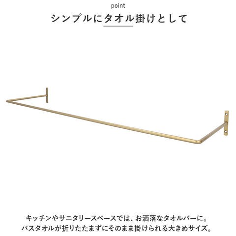 | 商品説明 | ソリッドな質感でお部屋を素敵にデコレーション!理想の空間づくりに役立つ「アイアンマルチバーLサイズ」が新登場。【素材の質感を生かすデザイン】アンティーク感たっぷりのアイアン素材を、一切の装飾を省いて、シンプルなフォルムに仕上げたバーハンガー。【シンプルにタオル掛けとして】キッチンやサニタリースペースでは、センスの良さが際立つお洒落なタオルバーに。バスタオルが折りたたまずにそのまま掛けられる大きめサイズ。【洋服用ハンガーラックに】奥行きを広めに持たせたフレーム形状で、玄関先や寝室では洋服用ハンガーを掛けてちょっとしたハンガーラックにも。【魅せる収納にも大活躍】S字フックと組み合わせて観葉植物やお気に入りの雑貨を吊るせば、魅せるハンギングディスプレイに早変わり。(※耐荷重約3.5kg)【D・I・Yで取り付け簡単!】壁面や建具にビスで4ヵ所固定するだけで、取り付けも簡単。(※ビス穴直径約4mm。取付用ビスは付属しておりません。)【お部屋に馴染んで、すっきり空間】開放的なインテリアを手軽に演出できる、細身で圧迫感のないフレームデザイン。 |