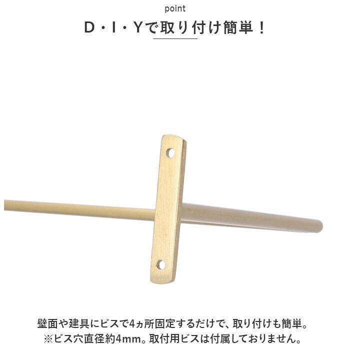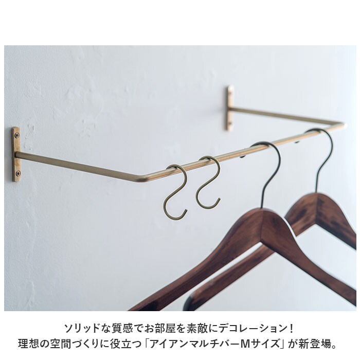 | 商品説明 | ソリッドな質感でお部屋を素敵にデコレーション!理想の空間づくりに役立つ「アイアンマルチバーMサイズ」が新登場。【素材の質感を生かすデザイン】アンティーク感たっぷりのアイアン素材を、一切の装飾を省いて、シンプルなフォルムに仕上げたバーハンガー。【シンプルにタオル掛けとして】キッチンやサニタリースペースでは、センスの良さが際立つお洒落なタオルバーに。フェイスタオルなら折りたたまずにそのまま掛けられるサイズ感。【洋服用ハンガーラックに】奥行きを広めに持たせたフレーム形状で、玄関先や寝室では洋服用ハンガーを掛けてちょっとしたハンガーラックにも。【魅せる収納にも大活躍】S字フックと組み合わせて観葉植物やお気に入りの雑貨を吊るせば、魅せるハンギングディスプレイに早変わり。(※耐荷重約3.5kg)【D・I・Yで取り付け簡単!】壁面や建具にビスで4ヵ所固定するだけで、取り付けも簡単。(※ビス穴直径約4mm。取付用ビスは付属しておりません。)【お部屋に馴染んで、すっきり空間】開放的なインテリアを手軽に演出できる、細身で圧迫感のないフレームデザイン。 |