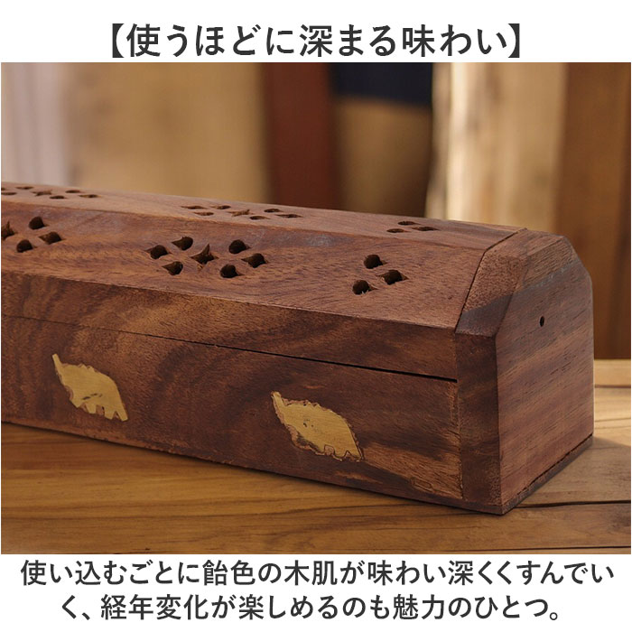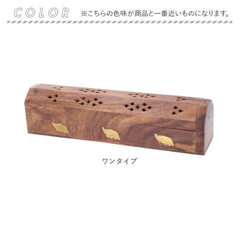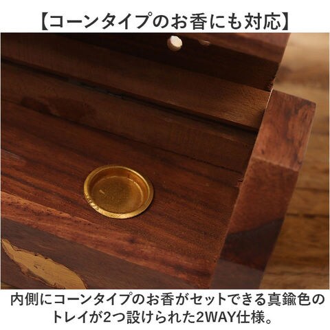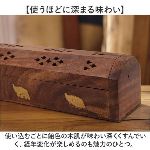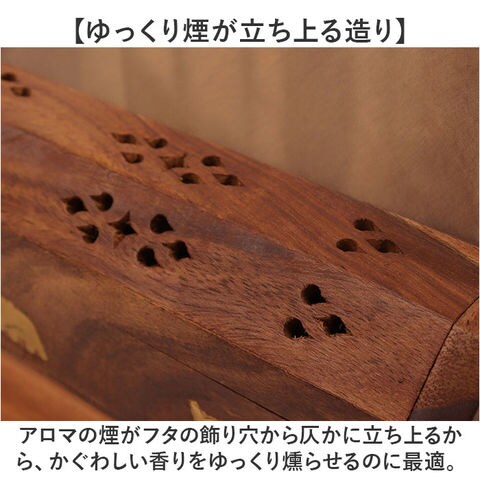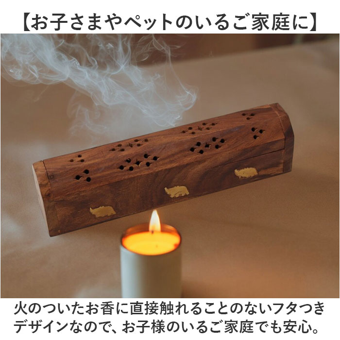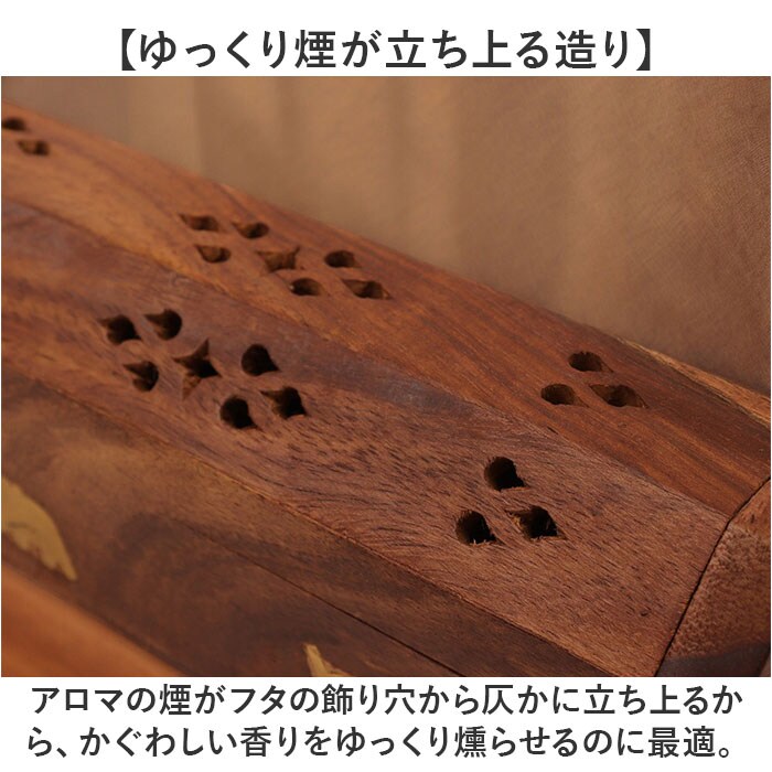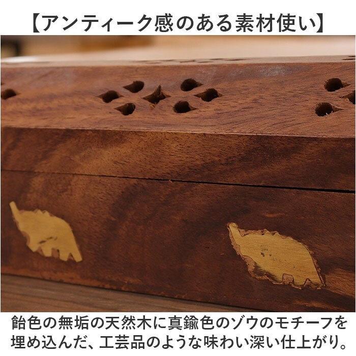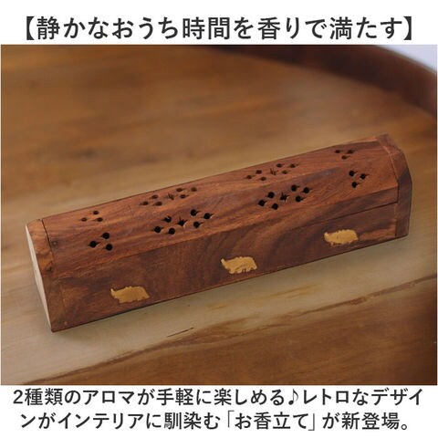 商品説明【静かなおうち時間を香りで満たす】2種類のアロマが手軽に楽しめる♪レトロなデザインがインテリアに馴染む「お香立て」が新登場。【アンティーク感のある素材使い】飴色の無垢の天然木に真鍮色のゾウのモチーフを埋め込んだ、工芸品のような味わい深い仕上がり。【スティックアロマのセットが簡単!】スティックタイプのお香をフタを開けて側面に差し込むだけ!火を灯せば、すぐにアロマタイム♪【コーンタイプのお香にも対応】内側にコーンタイプのお香がセットできる真鍮色のトレイが2つ設けられた2WAY仕様。【ゆっくり煙が立ち上る造り】アロマの煙がフタの飾り穴から仄かに立ち上るから、かぐわしい香りをゆっくり燻らせるのに最適。【お子さまやペットのいるご家庭に】火のついたお香に直接触れることのないフタつきデザインなので、お子様のいるご家庭でも安心。【使うほどに深まる味わい】使い込むごとに飴色の木肌が味わい深くくすんでいく、経年変化が楽しめるのも魅力のひとつ。【贅沢なおうち時間が過ごせる♪】お気に入りの香りで快適リラックス。ヨガやメディテーションなど心安らぐヒーリングタイムに。