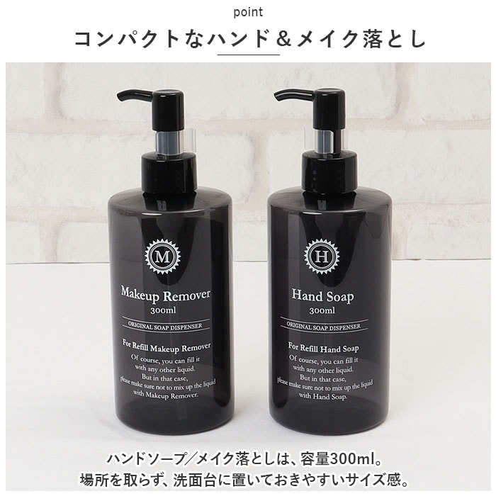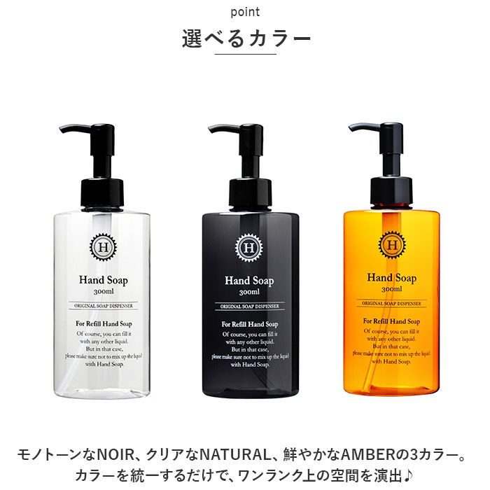 | 商品説明 | 水回りをおしゃれに☆気分を上げてくれる詰め替えボトル「ire-mono for BATH ROOM」が新登場。【スタイリッシュなデザイン】ボトルに英字やロゴをプリントした、シンプルなデザイン。ごちゃっとしがちな洗面やお風呂場がすっきりまとまって、生活感を抑えたスペースに。【軽量なプラスチック製】サッと手に取れる軽量設計。割れにくく角のないつくりなのでお子さまが触れたり、万が一落としてしまっても安心。【残量が確認しやすいクリアカラー】外側からも残量を確認しやすいクリアカラーボトル。補充のタイミングがすぐにわかる!(※NOIRは暗めのカラーなので、中身が少し見えにくい仕様です。)【しっかり吸い出すロングノズル】ノズルは底まで伸びるロングタイプ。少なくなったソープ類も、吸い出しやすいのがポイント。【たっぷり入るシャンプー&ボディ用】シャンプー/コンディショナー/ボディソープは、容量600ml。ボトル本体の口部分は、詰め替えがしやすい広めのつくり。【1プッシュで3ml吐出】何度もプッシュする手間を軽減。ロングヘアや、たっぷり使いたい方にもぴったり。【コンパクトなハンド&メイク落とし】ハンドソープ/メイク落としは、容量300ml。場所を取らず、洗面台に置いておきやすいサイズ感。【1プッシュで1グラム】・1度に出てくる量が少なく、無駄使いの防止にも!【選べるカラー】モノトーンなNOIR、クリアなNATURAL、鮮やかなAMBERの3カラー。カラーを統一するだけで、ワンランク上の空間を演出♪ |