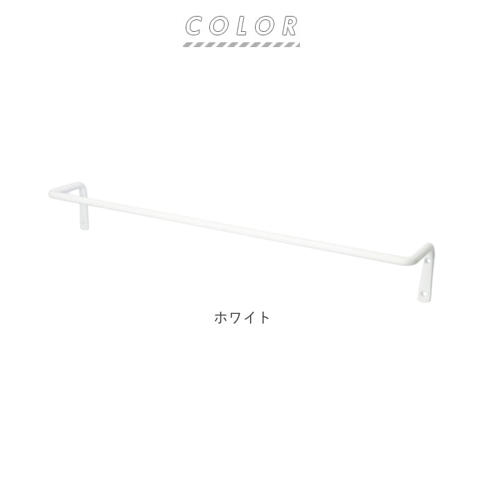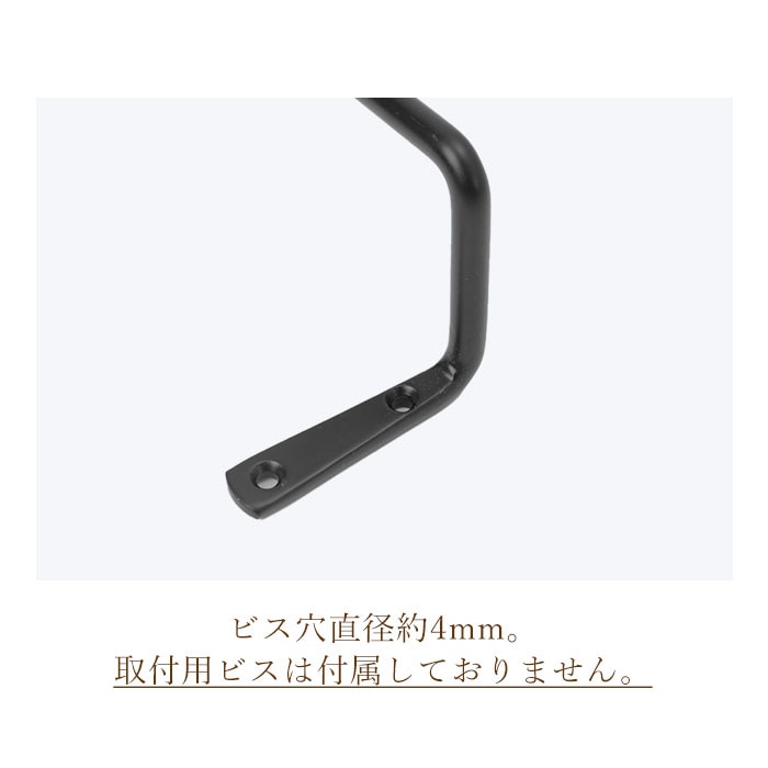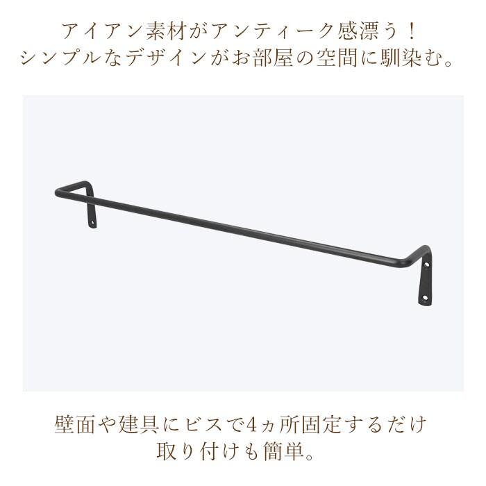 | 商品説明 | ソリッドな質感でお部屋を素敵にデコレーション!アイアンルームバーMサイズ。アンティーク感たっぷりのアイアン素材を、一切の装飾を省き、シンプルなフォルムに仕上げたバーハンガー。キッチンやサニタリースペースでは、センスの良さが際立つお洒落なタオルバーに。フェイスタオルなら折りたたまずにそのまま掛けられるサイズ感。S字フックと組み合わせて観葉植物やお気に入りの雑貨を吊るせば、魅せるハンギングディスプレイに早変わり。玄関スペースではアンブレラハンガーやスリッパホルダーなど、アイディア次第でアレンジ自在。壁面や建具にビスで4ヵ所固定するだけで、取り付けも簡単。(※ビス穴直径約4mm。取付用ビスは付属しておりません。) |