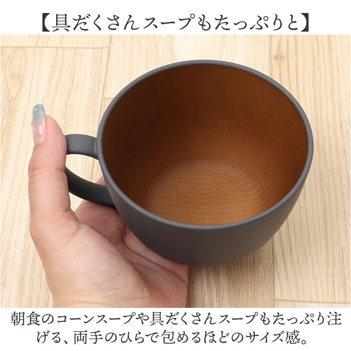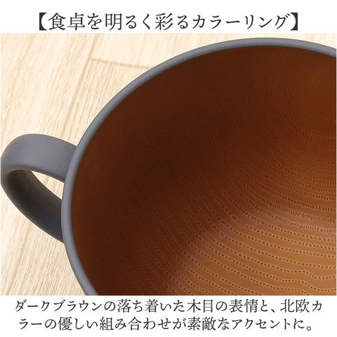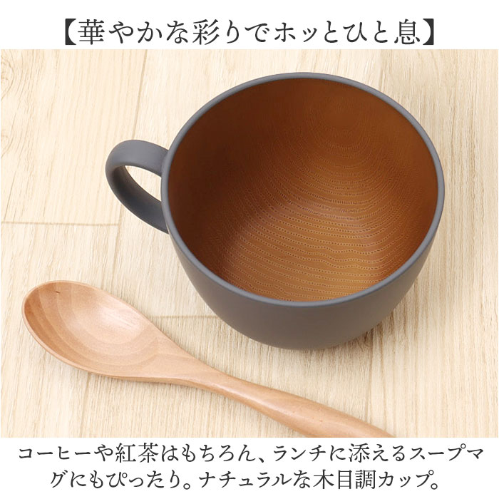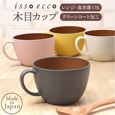 | 商品説明 | 【手軽におうちでカフェ気分♪】優しい木目の温もりをポップなカラーで縁取った「isso ecco 木目カップ」が新登場!【華やかな彩りでホッとひと息】コーヒーや紅茶はもちろん、ランチに添えるスープマグにもぴったり。ナチュラルな木目調カップ。【具だくさんスープもたっぷりと】朝食のコーンスープや具だくさんスープもたっぷり注げる、両手のひらで包めるほどのサイズ感。【おやつの時間にも大活躍】フチがゆったり広がったフォルムで、お子さまの大好きなミニデザートを盛り付けても可愛い。【汚れが落ちやすく、水切れスムーズ】防汚性・はっ水性に優れた内面クリーンコート加工で、毎日の家事やお手入れの手間がグっと楽に。【電子レンジ・食洗器の使用OK!】カップの素地は耐熱温度140度のPET・ABS樹脂素材。電子レンジでの温め直しや食洗機にも対応!【軽くて、丈夫で、割れにくい。】ふわっと軽く持ち運べて、落としても割れにくい丈夫さも魅力。キャンプやアウトドアでも大活躍。【食卓を明るく彩るカラーリング】ダークブラウンの落ち着いた木目の表情と、北欧カラーの優しい組み合わせが素敵なアクセントに。【伝統が息づく、安心の日本製品】温かみのある木目調の塗装は、樹脂製の素地に石川県加賀市・山中温泉地区に伝わる塗装技法「山中塗り」を施したもの。安心のMade in Japan製品。【About isso ecco -イッソ・エコ-】・「isso ecco」は、青山のテキスタイルデザイナーが手がける、カラフルな色使いと上質なものづくりにこだわったライフスタイルブランド。 |
