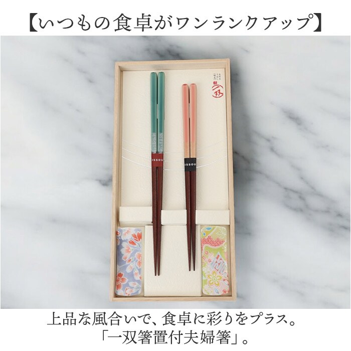 | 商品説明 | 【いつもの食卓がワンランクアップ】上品な風合いで、食卓に彩りをプラス。「一双箸置付夫婦箸」。【ご夫婦やカップルでお揃いに】カラーとサイズの異なるお箸&箸置きのセット。2人仲良く使えて、毎日の食事がもっと豊かに。【高級感のある桐箱入りギフト】ナチュラルで美しい桐箱。特別感のある、上質な仕上がり。【何層にも漆を重ねた伝統の若狭塗箸】福井県小浜市産、伝統工芸品の漆器。一層、二層、三層と、匠の想いを丁寧に重ね「一双」に。【傷を防げてデイリー使いに最適】お箸は天然木の素地に塗装を施すことで、傷つきをガード。毎日の食事のお供に。【アクセントになる箸置き】お箸と相性抜群な、箸置き。食卓が華やかに、ワンランクアップ!【年代問わず使いやすいデザイン】陶器のような質感のお箸と花柄の箸置き。結婚記念日のお祝いや、敬老の日のギフトにも。【ご夫婦へ縁起の良い贈り物】・「幸せの橋渡し」の意味合いを持つお箸。支え合って過ごしていくご夫婦に、心からの祝福を。 |